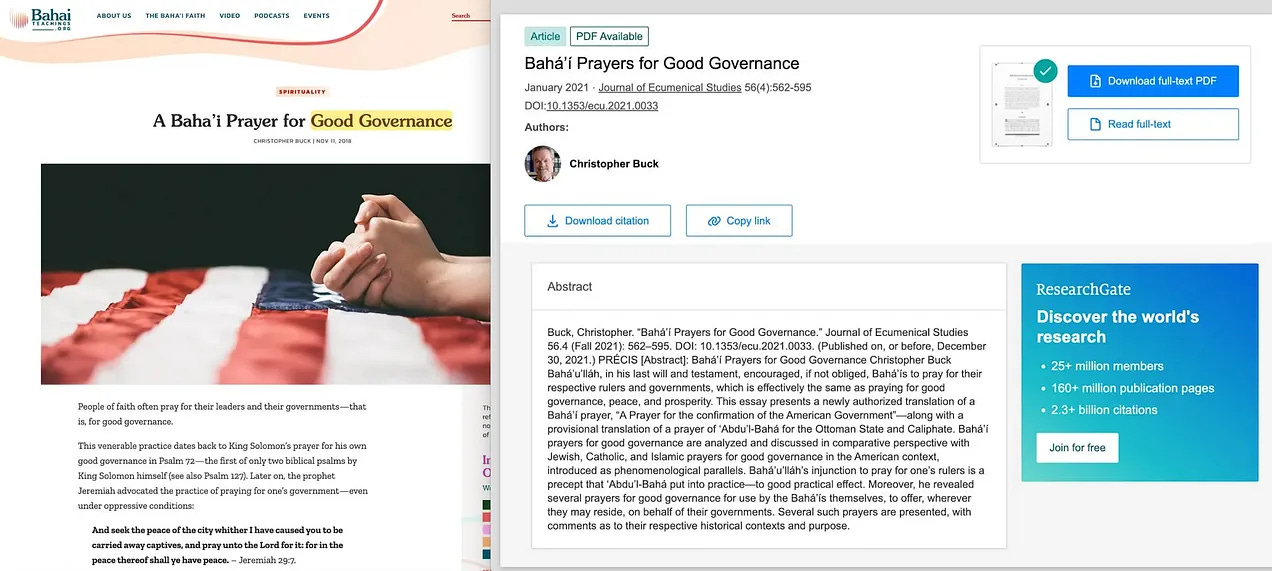 Η έννοια της χρηστής διακυβέρνησης [20] είναι βαθιά ενσωματωμένη στη σύγχρονη Bahá’í βιβλιογραφία [21] , αντανακλώντας τον αναπόσπαστο ρόλο της στο θεολογικό και διοικητικό πλαίσιο της πίστης. Από τη ρητή έκκληση του Bahá’u’lláh για δίκαιη διακυβέρνηση μέχρι τις προσευχές του ‘’Abdu’l-Bahá για τους κυβερνήτες και τα κράτη, οι διδασκαλίες του Bahá’í δίνουν έμφαση στη δικαιοσύνη, την υπευθυνότητα και τη διαχείριση ως θεμελιώδους σημασίας για την ηγεσία. Η παράδοση αυτή συνεχίζεται και σήμερα, με σύγχρονους μελετητές όπως ο Christopher Buck να εξετάζουν τις προσευχές του Bahá’í για χρηστή διακυβέρνηση σε συγκριτικά πλαίσια, ευθυγραμμίζοντάς τες με τις ευρύτερες διαθρησκειακές προοπτικές για την ηγεσία και την ηθική εξουσία. Η πίστη των Bahá’í όχι μόνο υποστηρίζει την ηθική ηγεσία, αλλά την ενσωματώνει ενεργά σε δομές διακυβέρνησης όπως ο Παγκόσμιος Οίκος Δικαιοσύνης, ενισχύοντας ένα πνευματικά καθοδηγούμενο μοντέλο παγκόσμιας διακυβέρνησης που εναρμονίζει το δίκαιο, την ηθική και τη διοικητική ευθύνη.