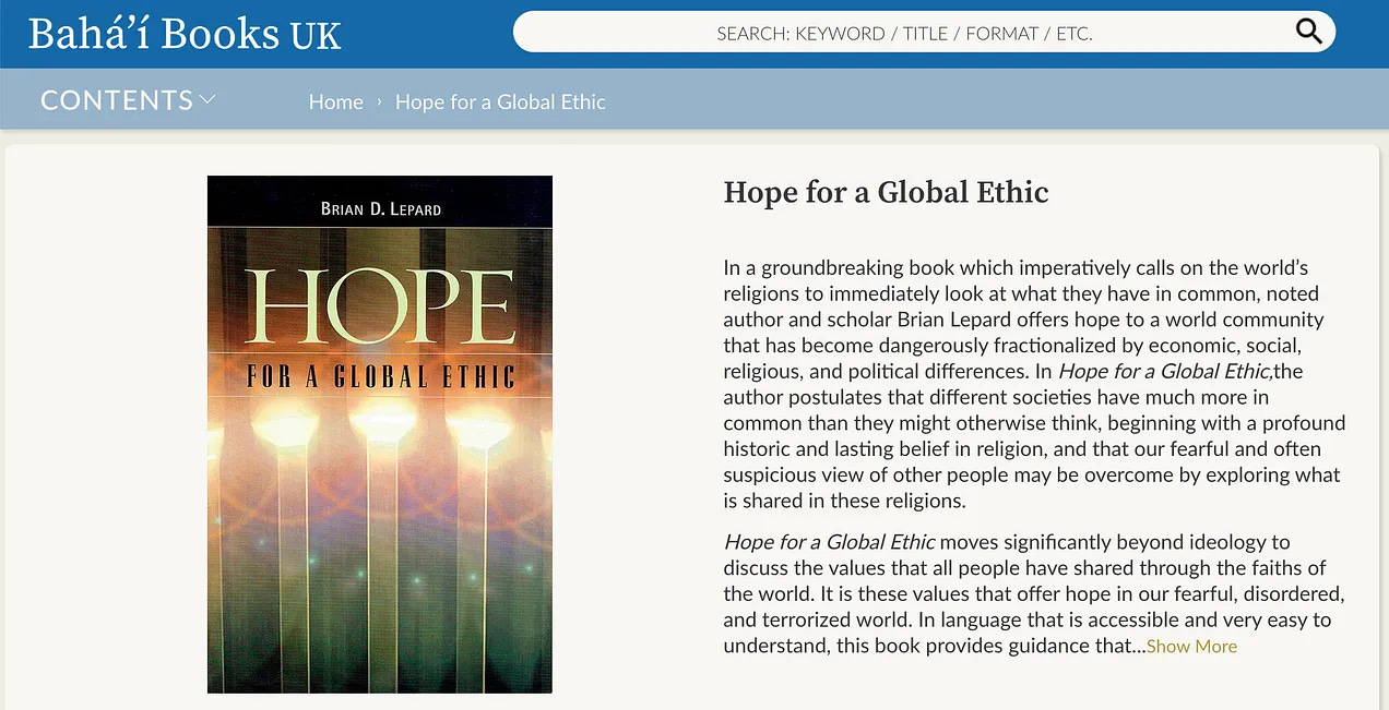 Και η έννοια της παγκόσμιας ηθικής είναι πραγματικά ένα επαναλαμβανόμενο θέμα στη βιβλιογραφία του Bahá’í [33] , που τονίζεται σταθερά ως το θεμέλιο για τη διεθνή ειρήνη, τη βιώσιμη διακυβέρνηση και την ανθρώπινη ενότητα. Το βιβλίο Hope for a Global Ethic επεκτείνει αυτή την αρχή διερευνώντας πώς τα ηθικά πλαίσια πρέπει να υπερβαίνουν τα εθνικά, θρησκευτικά και ιδεολογικά σύνορα για να προωθήσουν τη συνεργασία σε έναν διασυνδεδεμένο κόσμο. Στο πλαίσιο του οράματος του Bahá’í, η ηθική δεν είναι απλώς αφηρημένα ιδεώδη, αλλά ουσιαστικές κατευθυντήριες αρχές για τις πολιτικές, οικονομικές και κοινωνικές δομές. Και αυτή η προοπτική ευθυγραμμίζεται ιδιαίτερα καλά με την ευρύτερη ατζέντα του ΟΗΕ και πρωτοβουλίες όπως η Χάρτα της Γης και οι Στόχοι Βιώσιμης Ανάπτυξης, ενισχύοντας την ιδέα ότι η ηθική διακυβέρνηση είναι ζωτικής σημασίας για την παγκόσμια σταθερότητα. Ωστόσο, αυτό που διαφοροποιεί την προσέγγιση των Bahá’í είναι ότι δεν υποστηρίζει μόνο την ηθική, αλλά επιμένει στην αναγκαιότητα των νομικών δομών για τη διασφάλιση της εφαρμογής της.