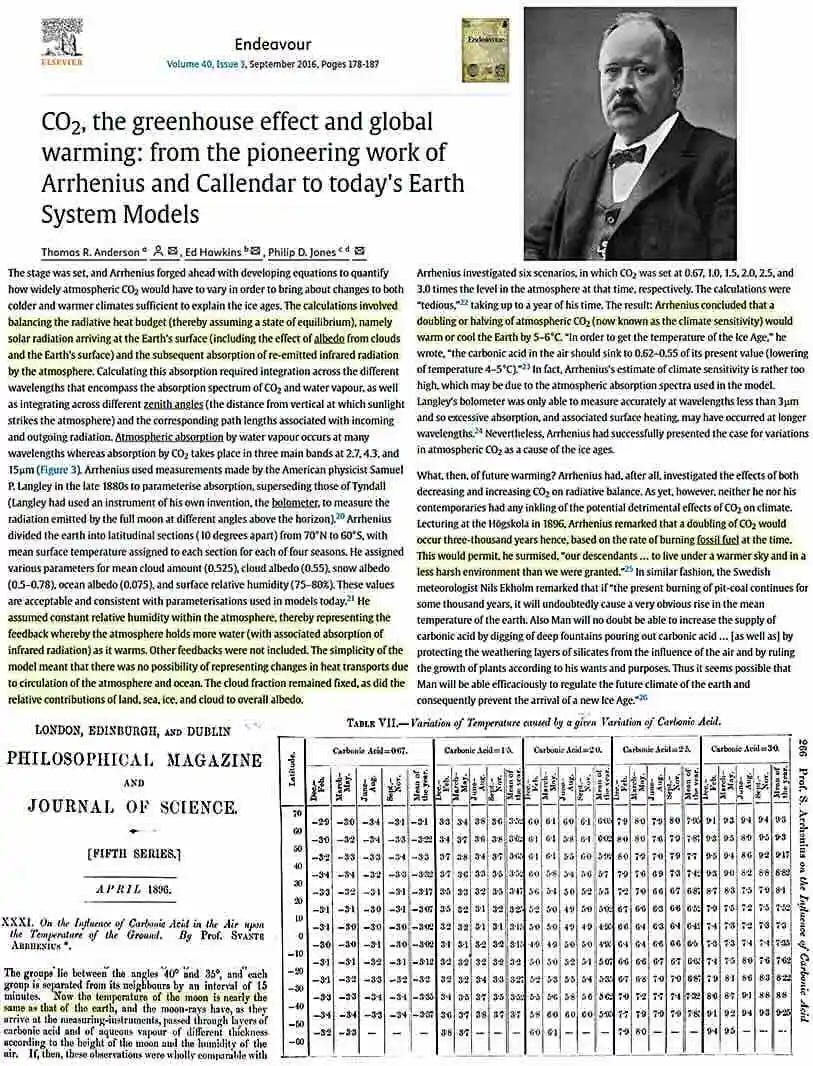 Ο Svante Arrhenius είναι γνωστός ως ο «νονός» του φαινομένου του θερμοκηπίου του CO2. Τα σημερινά κλιματικά μοντέλα εξακολουθούν να βασίζονται στους υπολογισμούς του 1896 σε πείραμα σκέψης για τη φανταστική ικανότητα του CO2 να θερμαίνει την επιφάνεια της Γης (71% νερό) από την παγωμένη στερεά κατάσταση κατά δεκάδες βαθμούς. [κάποια έμφαση, σύνδεσμοι προστέθηκαν]