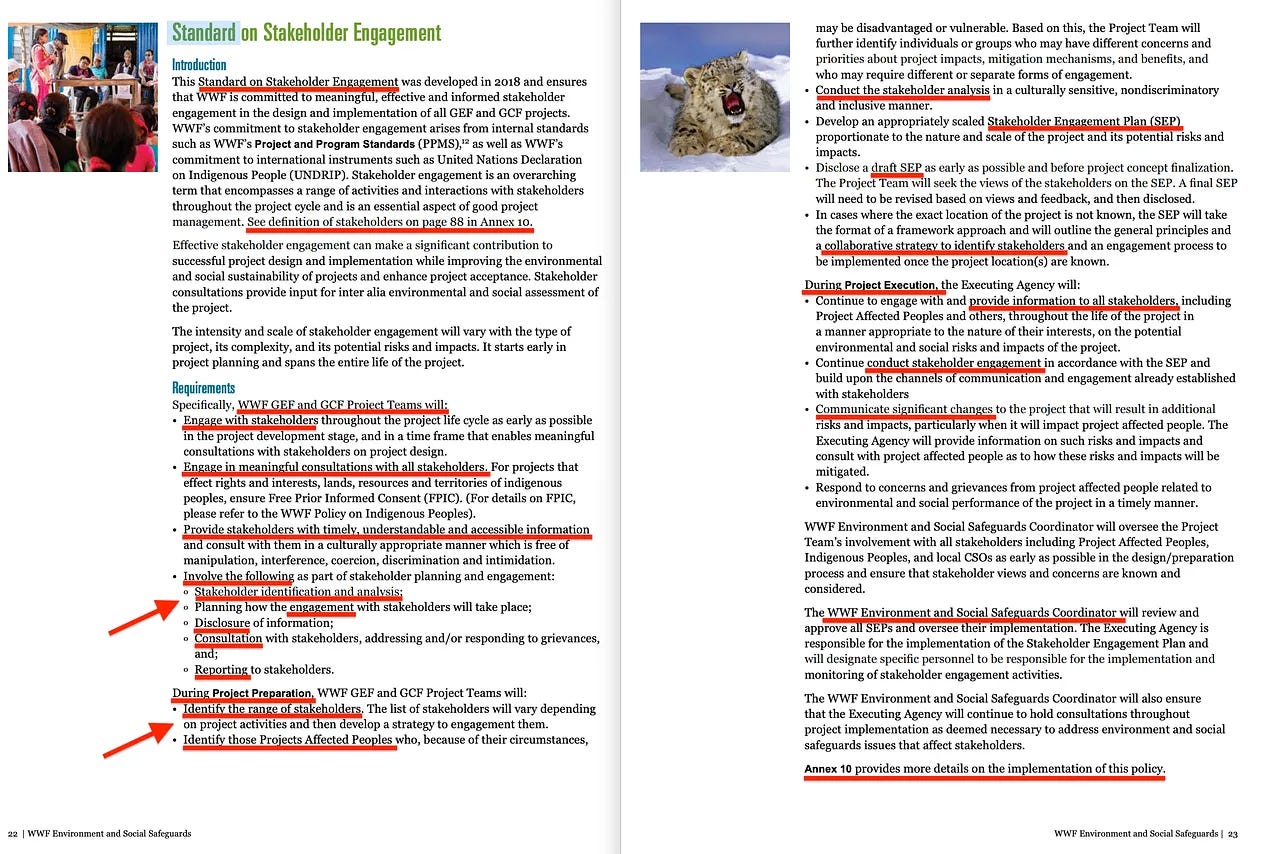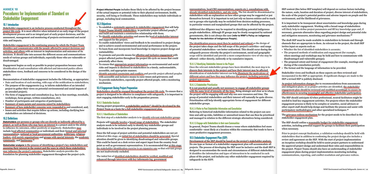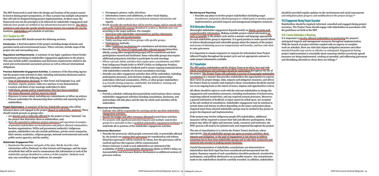 Το επόμενο έγγραφο έχει μόνο 2 σελίδες, αλλά περιέχει ενδιαφέρουσες παραδοχές. Πρόκειται για το «Πρότυπο για τη συμμετοχή των ενδιαφερομένων μερών» [7], το οποίο προέρχεται από το έγγραφο με τον πλήρη τίτλο «Περιβαλλοντικές και κοινωνικές διασφαλίσεις του WWF».