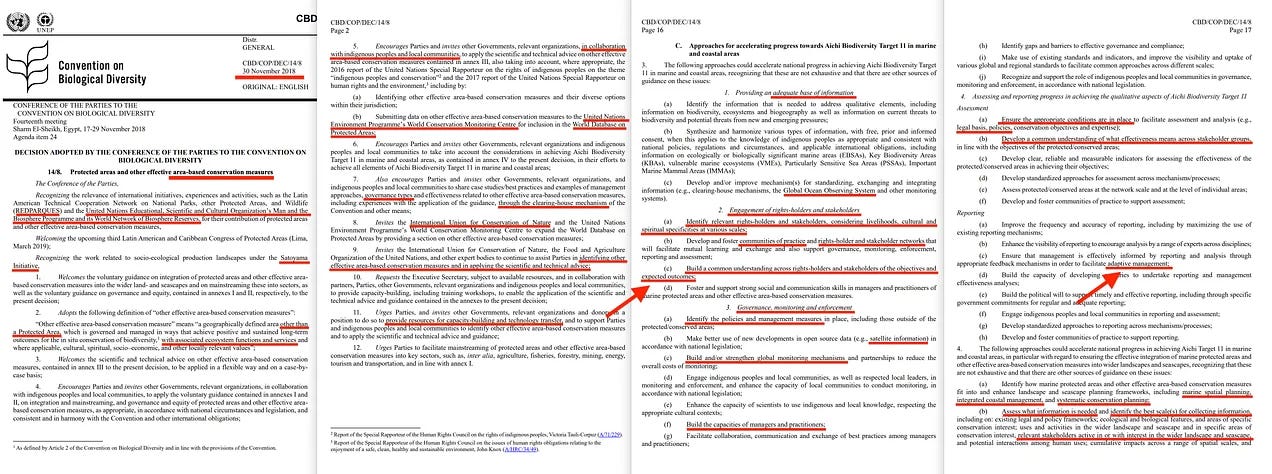 Η πρώτη αναφορά που θα εξετάσουμε είναι μια αναφορά της Σύμβασης για τη Βιολογική Ποικιλότητα, για τον απλό λόγο ότι αποτελεί την ανώτατη αρχή στο θέμα αυτό. Το 2018 εκδόθηκε το «CBD/COP/DEC/14/8», γνωστό και ως «Προστατευόμενες περιοχές και άλλα αποτελεσματικά μέτρα διατήρησης με βάση την περιοχή» [5]. Πρόκειται για ένα πολύ ενδιαφέρον έγγραφο, αν και δεν εξυπηρετεί πλήρως τον σκοπό του.