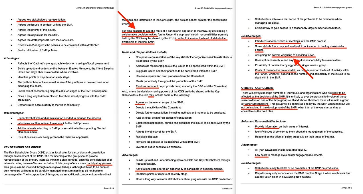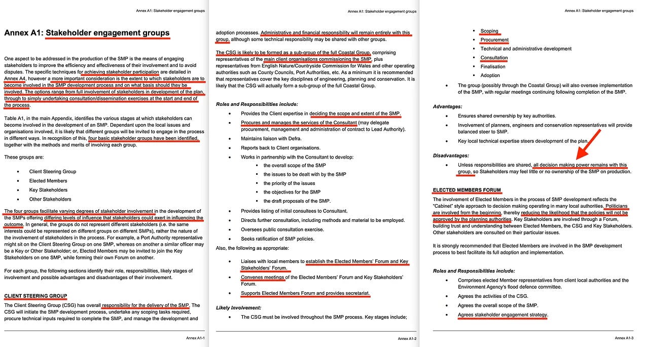 «Η συμμετοχή των εκλεγμένων μελών στη διαδικασία ανάπτυξης του SMP αντικατοπτρίζει την προσέγγιση τύπου «υπουργικού συμβουλίου» στη λήψη αποφάσεων που εφαρμόζεται σε πολλές τοπικές αρχές. Οι πολιτικοί συμμετέχουν από την αρχή, μειώνοντας έτσι την πιθανότητα οι πολιτικές να μην εγκριθούν από τις αρχές σχεδιασμού».