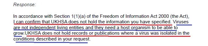 Η «Ομάδα Δικαιωμάτων Πληροφόρησης» της Υπηρεσίας Υγείας του Ηνωμένου Βασιλείου (UK Health Security Agency αντίστοιχο του ΕΟΔΥ) ομολόγησε επίσημα στον James ότι η υπηρεσία δεν διαθέτει καμία (0) μελέτη ή έκθεση που να περιγράφει την ανακάλυψη και τον καθαρισμό οποιουδήποτε υποτιθέμενου ιού από οποιονδήποτε άρρωστο «ξενιστή», άνθρωπο ή ζώο, από οποιονδήποτε, οπουδήποτε, οποτεδήποτε.