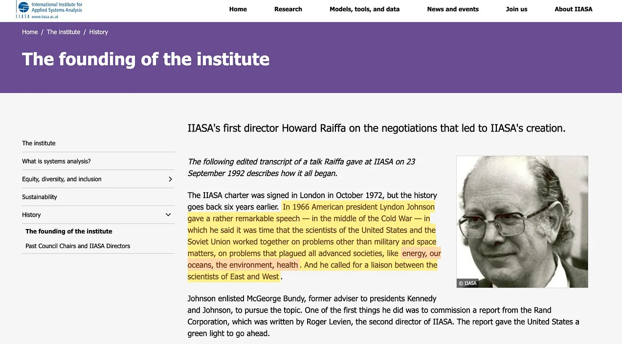 «Το 1966, ο Αμερικανός πρόεδρος Lyndon Johnson έδωσε μια μάλλον αξιοσημείωτη ομιλία — εν μέσω του Ψυχρού Πολέμου — στην οποία είπε ότι ήταν καιρός οι επιστήμονες των Ηνωμένων Πολιτειών και της Σοβιετικής Ένωσης να συνεργαστούν σε θέματα άλλα από τα στρατιωτικά και τα διαστημικά, σε προβλήματα που ταλαιπωρούσαν όλες τις προηγμένες κοινωνίες, όπως η ενέργεια, οι ωκεανοί μας, το περιβάλλον, η υγεία. Και κάλεσε σε συνεργασία τους επιστήμονες της Ανατολής και της Δύσης».