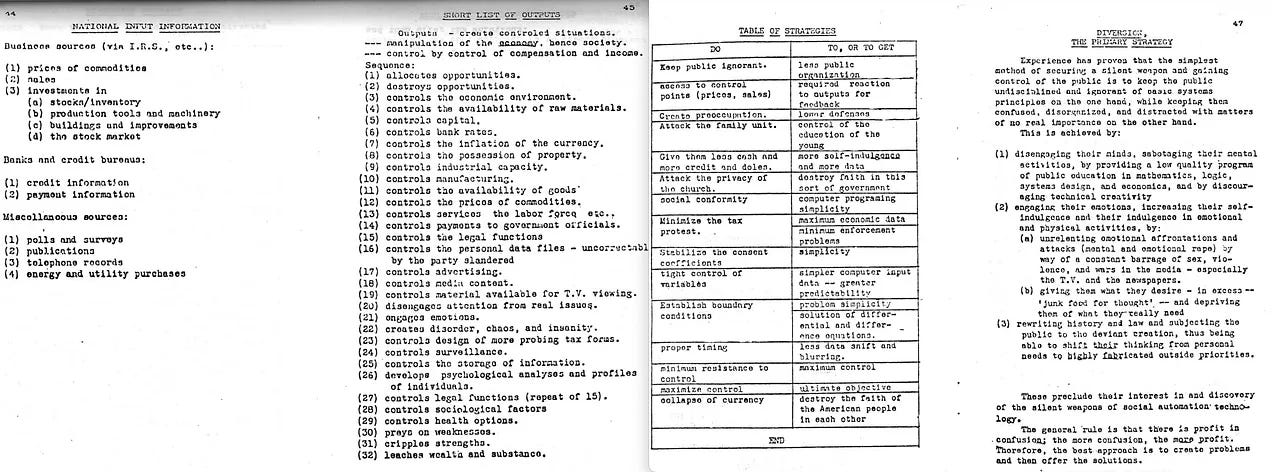 Έχουμε επίσης μια λίστα με τα αποτελέσματα που περιλαμβάνουν, ουσιαστικά, τον έλεγχο. Έλεγχο... των πάντων. Περιλαμβάνει ακόμη και έναν «πίνακα στρατηγικών», που περιλαμβάνει στοιχεία όπως «διατήρηση της άγνοιας του κοινού» και «επίθεση στις οικογενειακές μονάδες», καθώς αυτά οδηγούν σε «λιγότερη οργάνωση του κοινού» και «έλεγχο της εκπαίδευσης των νέων».