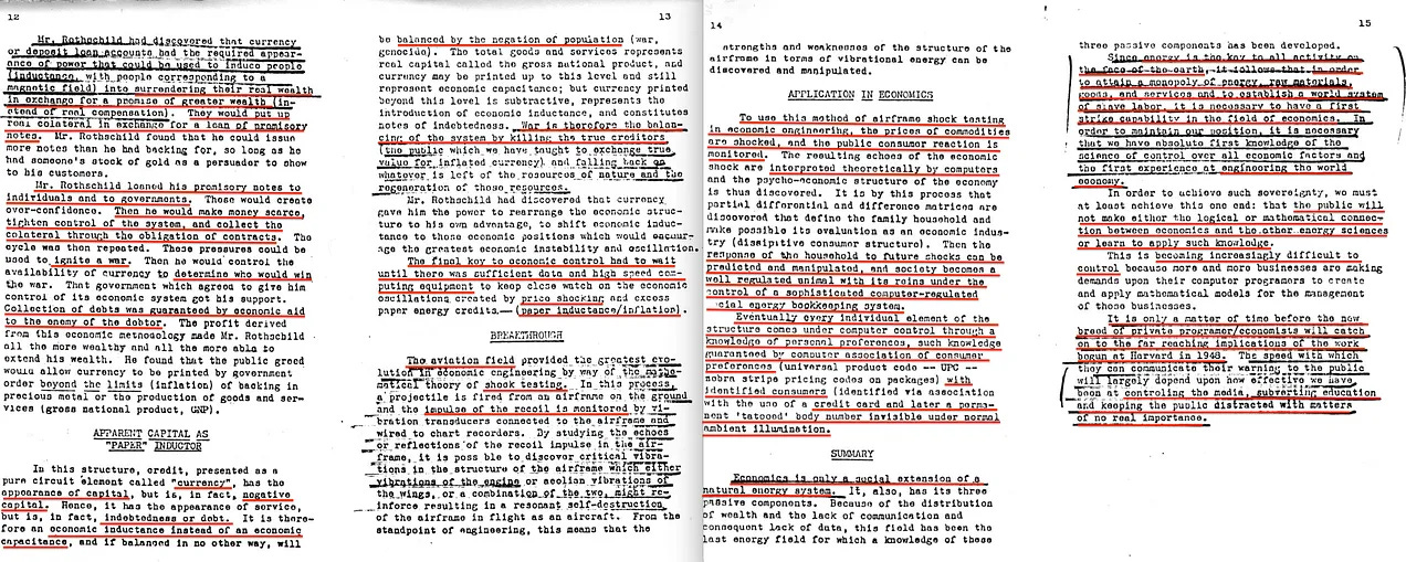 Μια επιλογή για την εξισορρόπηση της οικονομίας έρχεται μέσω του πολέμου, καθώς οι πραγματικοί πιστωτές σκοτώνονται, υπογραμμίζοντας με ακρίβεια πόσο ψυχροί και υπολογιστικοί είναι αυτοί οι άνθρωποι. Αλλά το «τελικό κλειδί για τον οικονομικό έλεγχο έπρεπε να περιμένει μέχρι να υπάρχουν επαρκή δεδομένα και εξοπλισμός υπολογιστών υψηλής ταχύτητας» προκειμένου να συμβαδίσει με τους συνεχείς, προγραμματισμένους κύκλους των σοκαριστικών τιμών και της υπερβολικής δημιουργίας νομίσματος που σχεδιάζουν, με σκοπό να ληστέψουν σταδιακά το κοινό.