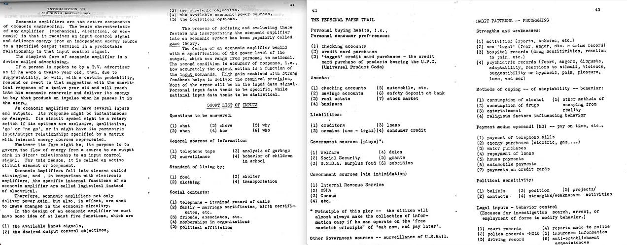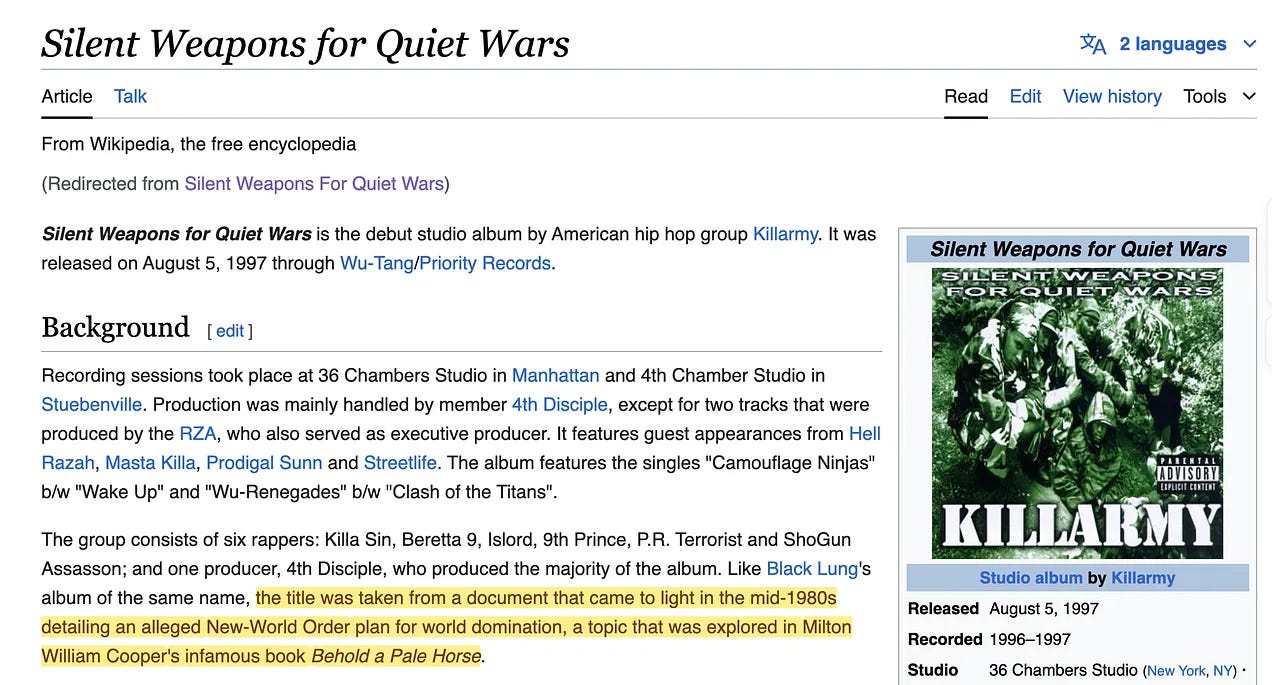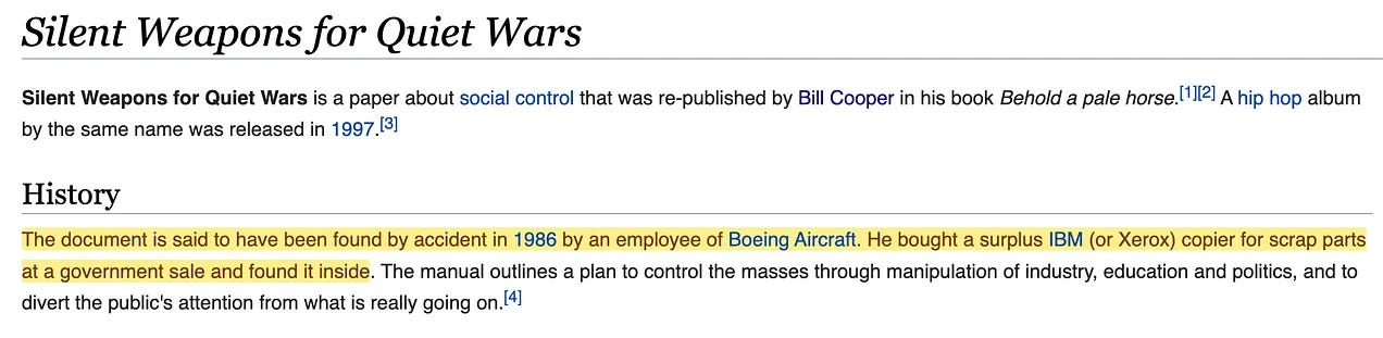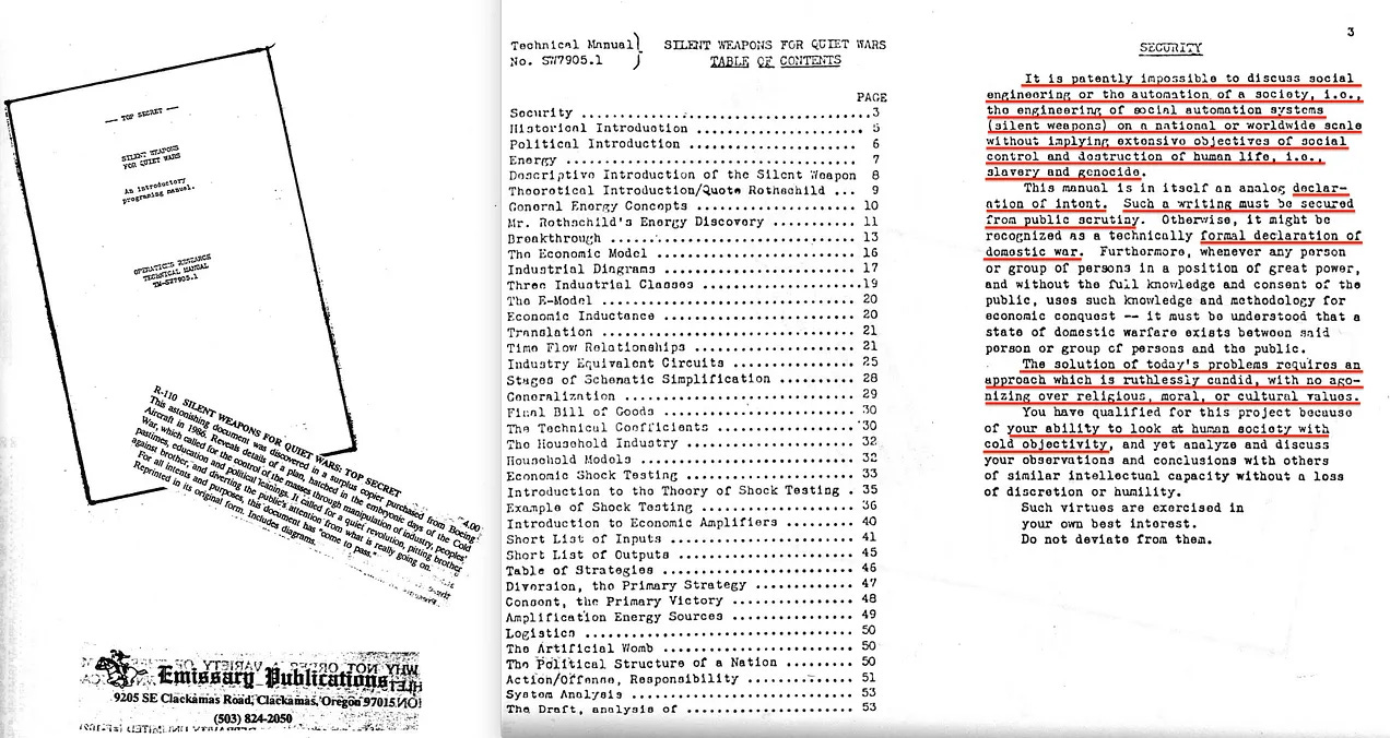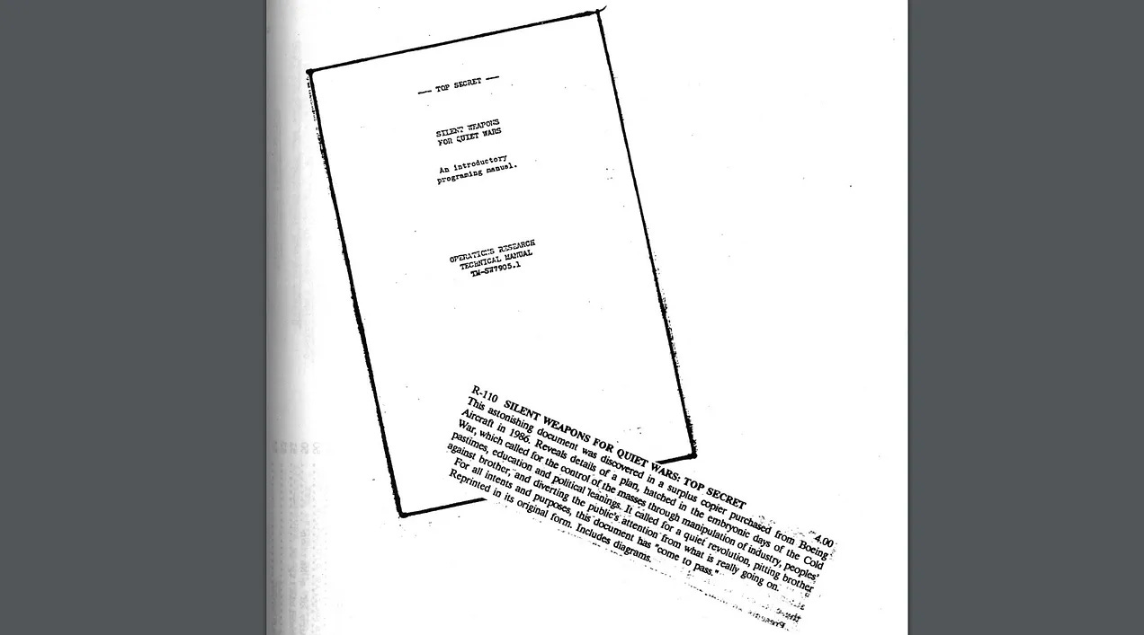 Όχι, ας ξεκινήσουμε με το έγγραφο: ‘Silent Weapons for Quiet Wars’ («Σιωπηλά όπλα για ήσυχους πολέμους»), που δημοσιεύθηκε το 1979 [1]. Υπό κανονικές συνθήκες, θα περίμενα η Wikipedia να έχει ένα άρθρο για ένα θέμα όπως αυτό, αν όχι για άλλο λόγο, τουλάχιστον για να ξεκαθαρίσει ότι πρόκειται σίγουρα για μια τρελή θεωρία συνωμοσίας, αλλά όχι – προφανώς ένα στούντιο άλμπουμ των Wu-Tang Clan είναι πιο σημαντικό από ένα έγγραφο που περιγράφει ένα σχέδιο παγκόσμιας άλωσης [2].
