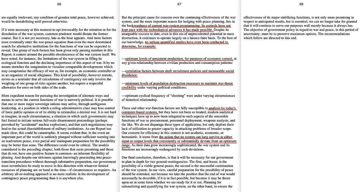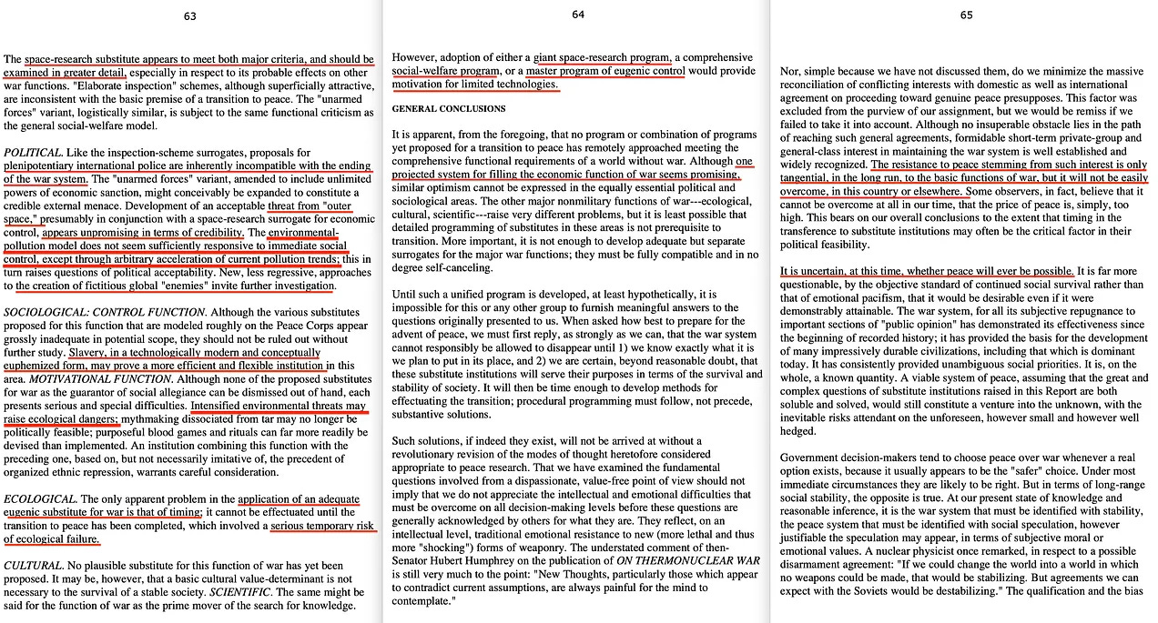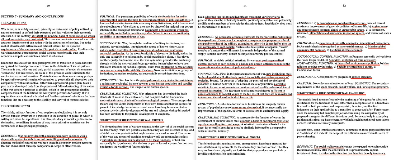 «ΚΟΙΝΩΝΙΚΟ. Πρώτον, σε περίπτωση μόνιμης απουσίας πολέμου, πρέπει να αναπτυχθούν νέοι θεσμοί που θα ελέγχουν αποτελεσματικά τα κοινωνικά καταστροφικά τμήματα των κοινωνιών. Δεύτερον, για να προσαρμοστεί η φυσική και ψυχολογική δυναμική της ανθρώπινης συμπεριφοράς στις ανάγκες της κοινωνικής οργάνωσης, ένα αξιόπιστο υποκατάστατο του πολέμου πρέπει να δημιουργεί έναν πανταχού παρόντα και εύκολα κατανοητό φόβο προσωπικής καταστροφής. Αυτός ο φόβος πρέπει να είναι τέτοιας φύσης και βαθμού ώστε να εξασφαλίζει την τήρηση των κοινωνικών αξιών στο μέγιστο βαθμό που αναγνωρίζεται ότι υπερβαίνουν την αξία της ατομικής ανθρώπινης ζωής».