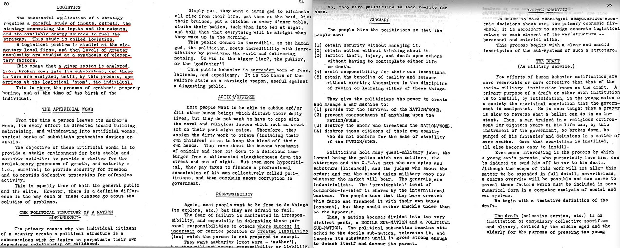 Προς το τέλος του εγγράφου, το κλίμα γίνεται πολύ, πολύ σκοτεινό. Το σχέδιο, για παράδειγμα, είναι να ενσταλάξει νέες αξίες στους νέους άνδρες, επειδή μια μόνο σφαίρα σε ένα δευτερόλεπτο μπορεί να οδηγήσει αμέσως στην απόρριψη, δηλαδή, δεκαετιών θρησκευτικής ανατροφής. Δεν νομίζω ότι υπάρχει κάτι να χάσουμε αν δεν καλύψουμε αυτό το υλικό, αλλά καταλαβαίνω ότι όλα αυτά στοχεύουν στην καταστροφή της οικογένειας, στην υπονόμευση της εξουσίας του πατέρα, στον εκβιασμό του γιου του να συμμετάσχει σε πολέμους, ενώ η κόρη του μαθαίνει να περιμένει να της προσφέρονται τα πάντα, ανεξάρτητα από το κόστος.