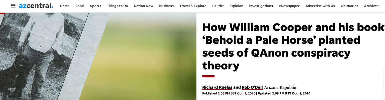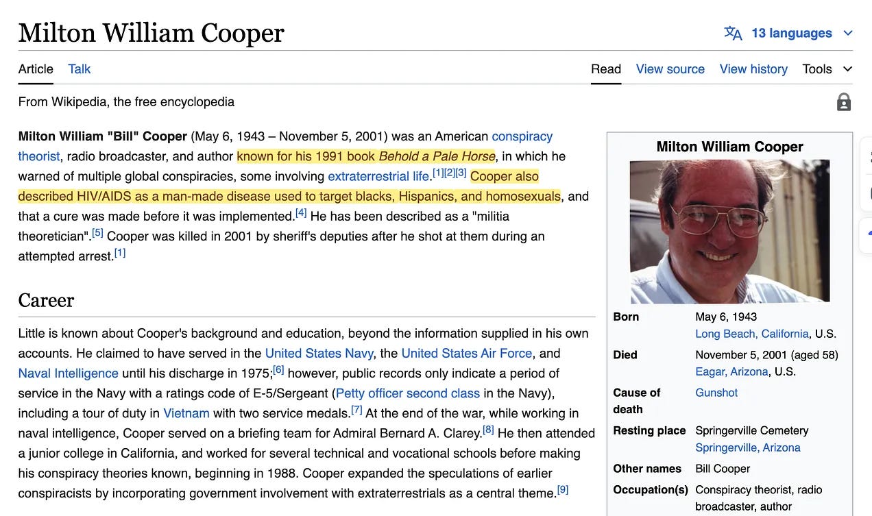 Και αν κάνετε το μοιραίο, μοιραίο λάθος να κοιτάξετε τη σελίδα του στη Wikipedia, θα ενημερωθείτε ότι ο άνθρωπος αυτός ήταν ένας τρελός συνωμοσιολόγος, που μισούσε τους μαύρους, τους ισπανόφωνους και τους ομοφυλόφιλους [3]. Οπότε φύγετε - δεν θέλετε να συσχετιστείτε με κανέναν από αυτούς, έτσι δεν είναι, εσείς οι λανθάνοντες οπαδοί του «QAnon» [4], ρατσιστές ομοφοβικοί.