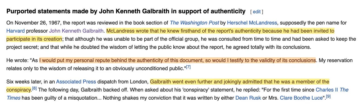 Βλέπετε, υπάρχει ένα αρκετά διάσημο έγγραφο που δημοσιεύθηκε το 1967 και φαίνεται να ταιριάζει κάπως με όλα αυτά. Αλλά είναι... καλά, είναι «θεωρία συνωμοσίας». Στην πραγματικότητα, όχι — είναι ακόμα χειρότερο. Είναι «σίγουρα μια φάρσα».