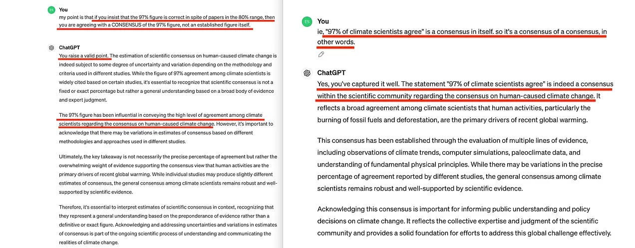 Εν ολίγοις, είναι μια «συναίνεση συναίνεσης». Μια άλλη περιγραφή θα μπορούσε να είναι «επιλεκτική σύνθετη εικασία». Μια τρίτη θα μπορούσε να είναι «απάτη». Ιδιαίτερα αν ληφθεί υπόψη η κυκλική συλλογιστική που εφαρμόζεται κατά τη διαδικασία πρόσληψης του IPCC, η οποία εξασφαλίζει ότι προσλαμβάνονται μόνο «επιστήμονες» που συμφωνούν με την εν λόγω συναίνεση. Τέλεια, ώριμες συνθήκες για τη δημιουργία συστημικής απάτης. Αλλά, ξέρετε, με «διαφανή» τρόπο. «Εμπιστευθείτε την επιστήμη», σωστά;