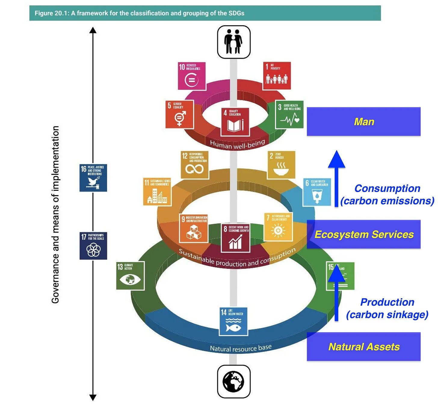 Διότι αν τους ανιχνεύσουμε αντίστροφα, διαπιστώνουμε ότι η βάση των φυσικών πόρων παρέχει υπηρεσίες οικοσυστημάτων (παραγωγή, που χρησιμοποιούνται από τον άνθρωπο για κατανάλωση). Και αυτό, με τη σειρά του, οδηγεί λογικά στο να καταστούν οι οικοσυστημικές υπηρεσίες κεντρικό στοιχείο αυτής της στρατηγικής, καθώς η παραγωγή τους πρέπει να ισορροπείται με βιώσιμο τρόπο με τις απαιτήσεις της ανθρωπότητας. Και πώς μπορεί τελικά να επιτευχθεί αυτή η ισορροπία; Μέσω της διακυβέρνησης και των μέσων εφαρμογής, που μοιάζουν ύποπτα με έναν επαγωγέα ηλεκτρικού κυκλώματος σε ένα πηνίο, αποτελούμενο από την ανθρώπινη ευημερία ως αντίσταση στην αγωγιμότητα των οικοσυστημικών υπηρεσιών, που τελικά οδηγεί πίσω στην παροχή των εν λόγω υπηρεσιών, χάρη στα φυσικά περιουσιακά στοιχεία που βρίσκονται στη βάση.