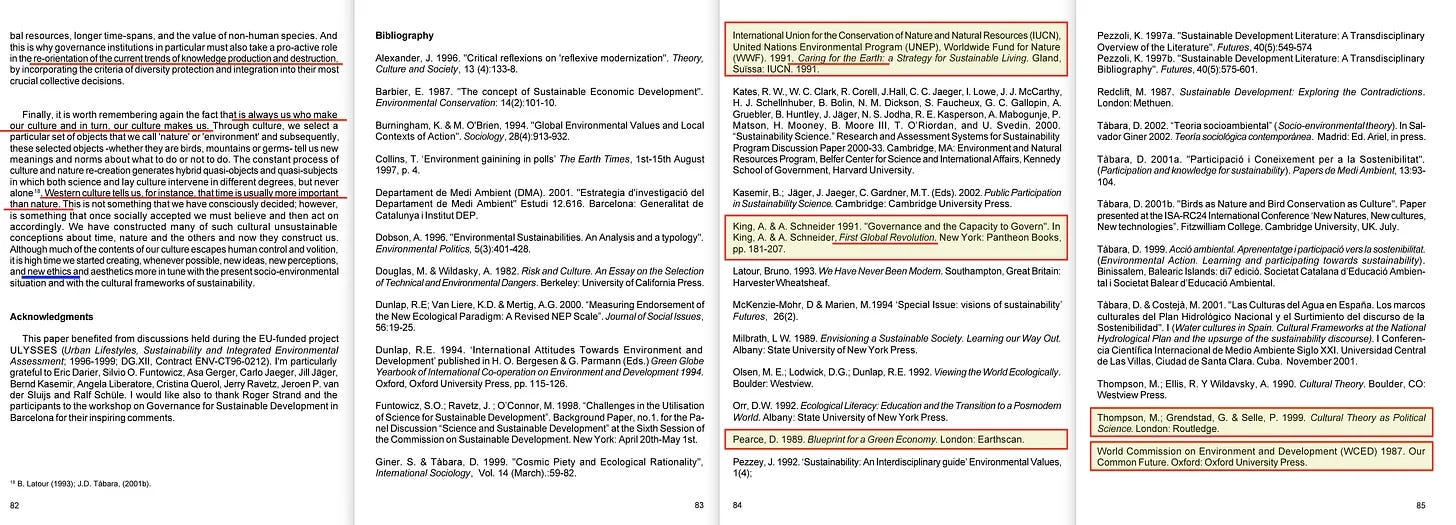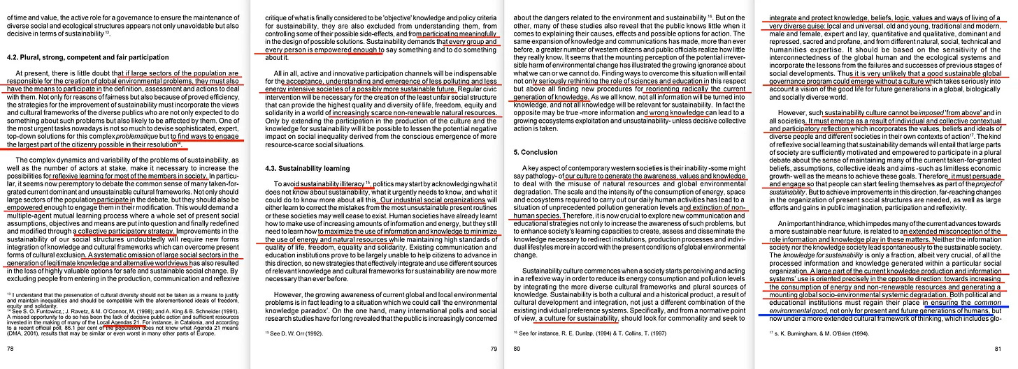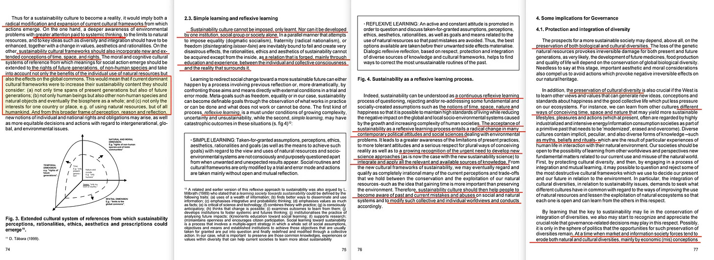 Και αυτό επιβεβαιώνεται αμέσως μετά μέσω της περίεργης συμπερίληψης ότι «πρέπει να δοθεί (μεγαλύτερη προσοχή) στη συστημική σκέψη» και ότι αυτά τα «πολιτισμικά πλαίσια» πρέπει να ενσωματώσουν νέες και διευρυμένες αντιλήψεις για τον χρόνο, τον χώρο και τα δικαιώματα - όπου τα τελευταία σχετίζονται τόσο με το μέλλον (που ήδη αντικατοπτρίζεται μέσω της προηγούμενης αναφοράς του χρόνου) όσο και με τα μη ανθρώπινα είδη.