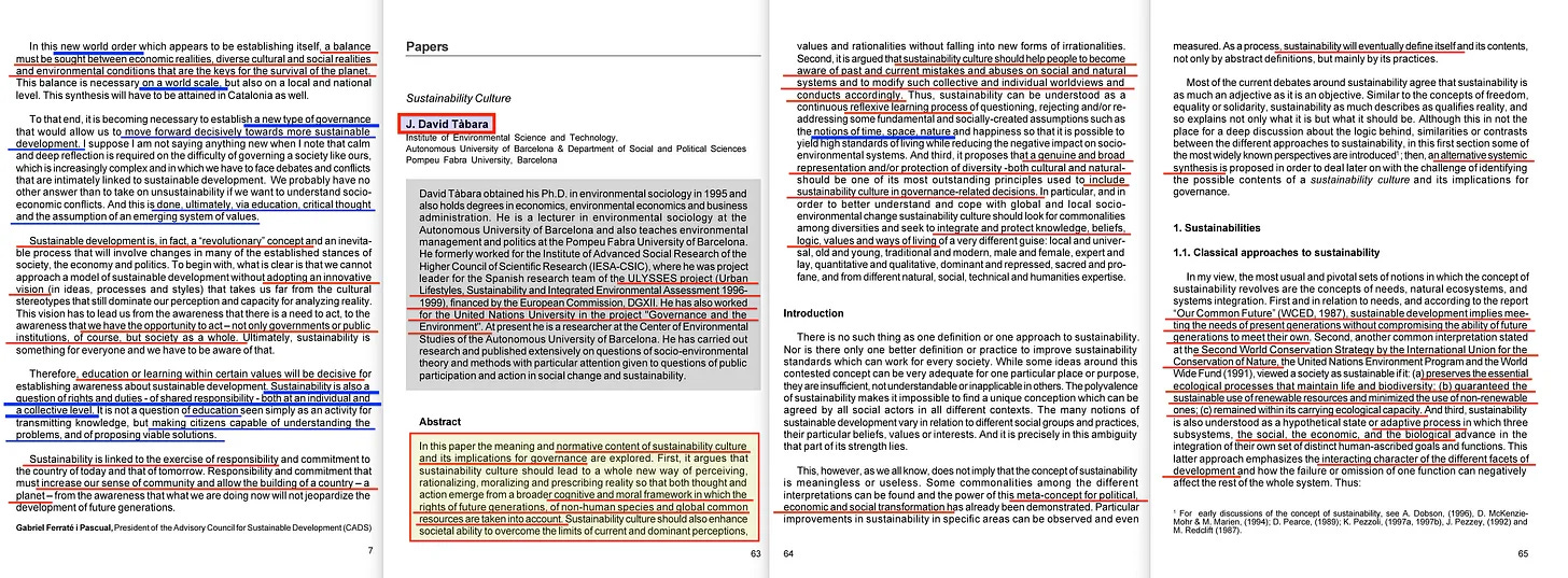 Και είναι σε αυτή την πλευρά του νομίσματος που η εργασία του Tabara από το 2002 γίνεται αξιοσημείωτη. Με τίτλο: ‘Sustainability Culture’ («Κουλτούρα της Βιωσιμότητας» )[2], παρουσιάστηκε για πρώτη φορά σε ένα εργαστήριο για τη βιώσιμη ανάπτυξη στη Βαρκελώνη και καθόρισε ότι απαιτείται ένα νέο σύνολο αξιών για τη σύνθεση της παγκοσμιοποίησης, της ταυτότητας, της διακυβέρνησης και της βιωσιμότητας. Και αυτό - φυσικά - οδηγεί κατευθείαν στην έκκληση για μια νέα παγκόσμια ηθική. Και σε σχέση με το χρονοδιάγραμμα, αυτό εντάσσεται σχεδόν αμέσως μετά την έναρξη της Πλανητικής Ηθικής της Χάρτας της Γης, η οποία προτάθηκε για πρώτη φορά μέσω του Caring for the Earth (1991) της IUCN και της World Conservation Strategy (Παγκόσμιας Στρατηγικής Διατήρησης) πριν από αυτό (1980).