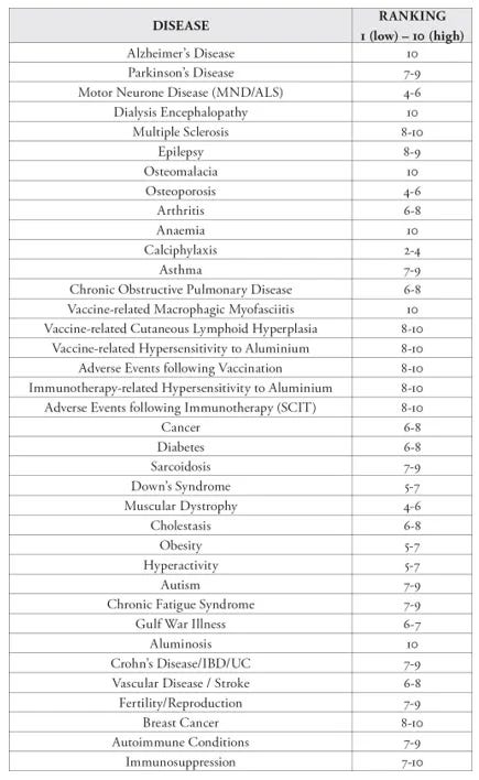 Ο Exley παρουσιάζει έναν αναλυτικό πίνακα που κατατάσσει την πιθανή εμπλοκή του αλουμινίου σε διάφορες ανθρώπινες ασθένειες με βάση τη δημοσιευμένη επιστημονική βιβλιογραφία. Ο πίνακας περιλαμβάνει καταστάσεις όπως η νόσος του Alzheimer, η νόσος του Parkinson, η σκλήρυνση κατά πλάκας και ο αυτισμός, μεταξύ άλλων.