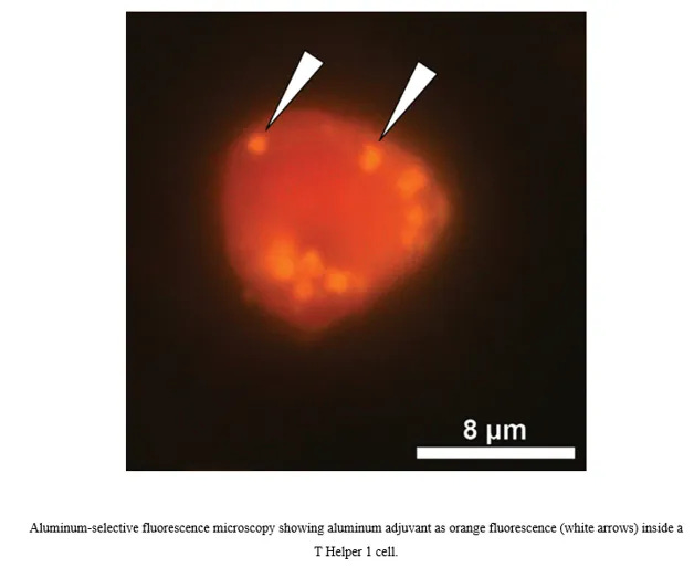 Αυτό που βλέπετε είναι ένα Τ-κύτταρο που κλήθηκε σε ένα σημείο έγχυσης εμβολίου, για να κάνει κάποια καθαριότητα, και «καταβρόχθισε» λίγο από το αλουμίνιο που βρήκε εκεί. Μη μπορώντας να το χωνέψει, θα κάνει τις άλλες δουλειές του στο σώμα, δυσκοίλιο με αλουμίνιο, μέχρι τελικά να βρει το δρόμο του στον εγκέφαλο του μωρού, ενεργοποιώντας μια φλεγμονώδη ανοσολογική αντίδραση στον εγκέφαλο του μωρού που θα δημιουργήσει μια σειρά από καταστάσεις, συμπεριλαμβανομένου του αυτισμού.