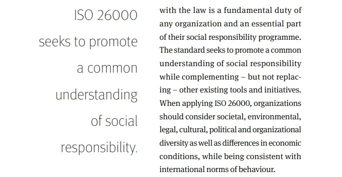 Το ISO 26000 [15] παρέχει καθοδήγηση για την κοινωνική ευθύνη, περιγράφοντας αρχές και βασικά θέματα που πρέπει να αντιμετωπίζουν οι οργανισμοί για να λειτουργούν ηθικά και βιώσιμα.