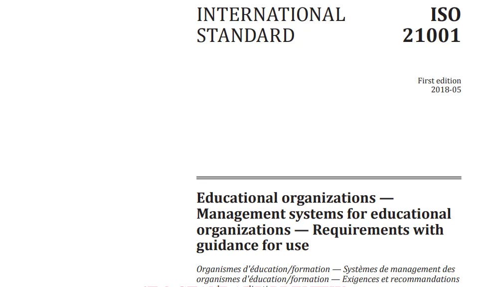 Το ISO 21001 [12] θέτει απαιτήσεις για τα συστήματα διαχείρισης των εκπαιδευτικών οργανισμών, με στόχο τη βελτίωση των μαθησιακών διαδικασιών, την ικανοποίηση των μαθητών και την ευθυγράμμιση με ευρύτερους κοινωνικούς και αναπτυξιακούς στόχους.