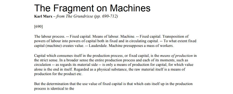 Αυτό ευθυγραμμίζεται απροσδόκητα με την παρατήρηση του Καρλ Μαρξ στο Απόσπασμα για τις Μηχανές [58] ότι «η ανάπτυξη του πάγιου κεφαλαίου δείχνει σε ποιο βαθμό η γενική κοινωνική γνώση έχει γίνει άμεση δύναμη της παραγωγής». Με άλλα λόγια, η εργασία δεν αποτιμάται πλέον κυρίως για τη χειρωνακτική εργασία, αλλά για το βαθμό στον οποίο ευθυγραμμίζεται, συμπληρώνει ή προσαρμόζεται στις αυτόνομες διαδικασίες της μηχανής. Υπό αυτό το καθεστώς, οι άνθρωποι επανατοποθετούνται ως ηθικά και συναισθηματικά αντίβαρα στα αυτοματοποιημένα συστήματα - εκτελώντας τα αναπόφευκτα ανθρώπινα καθήκοντα της ηθικής διαμεσολάβησης, της συναισθηματικής φροντίδας και της ευφάνταστης καινοτομίας, τα οποία οι μηχανές δεν μπορούν να αναπαράγουν, αλλά τα οποία το σύστημα εξακολουθεί να απαιτεί προκειμένου να διατηρήσει τη νομιμότητα και την ευελιξία του.