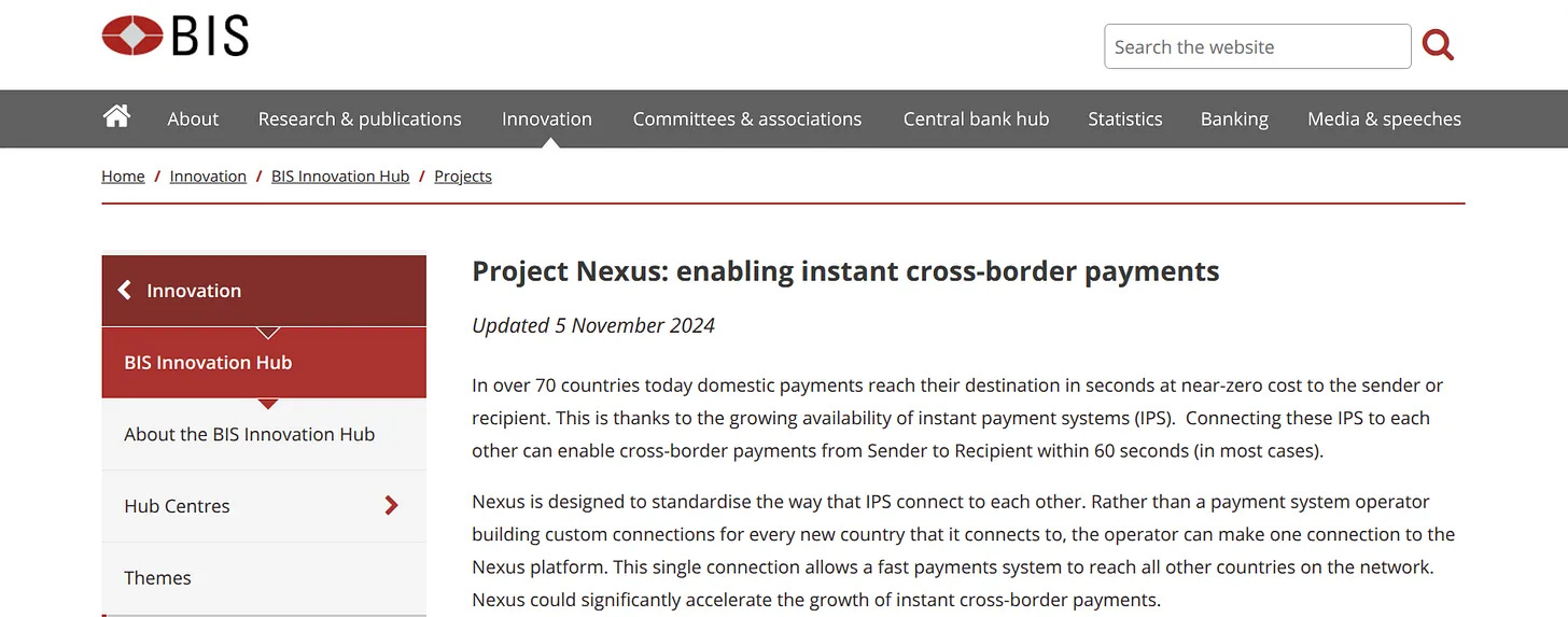 Το Nexus συνδέει τα υφιστάμενα εγχώρια συστήματα ταχείας πληρωμής (FPS) και τα δίκτυα ακαθάριστου διακανονισμού σε πραγματικό χρόνο (RTGS) (όπως το UPI της Ινδίας, το FAST της Σιγκαπούρης ή το TIPS της ΕΕ), επιτρέποντας τις διασυνοριακές πληρωμές λιανικής χωρίς να απαιτείται πλήρης ανάπτυξη CBDC. Χρησιμεύει ως μεταβατική υποδομή, προετοιμάζοντας τα παλαιά συστήματα για ενδεχόμενη σύγκλιση με προγραμματιζόμενες πλατφόρμες χρηματοδότησης όπως το mBridge.