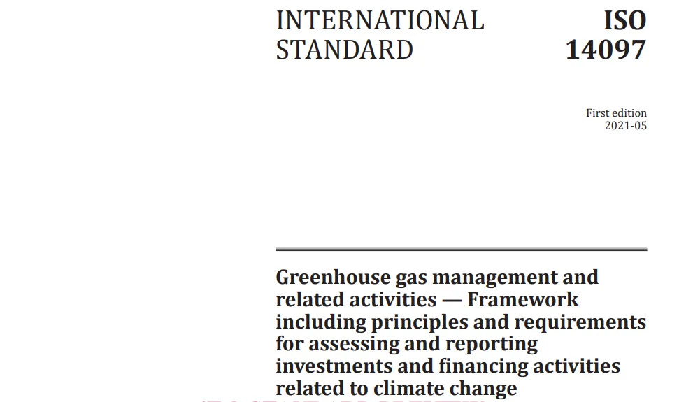 Το ISO 14097 [11] προσφέρει ένα πλαίσιο για την αξιολόγηση των επενδύσεων που σχετίζονται με το κλίμα, το οποίο περιέχει δείκτες για στόχους εκπομπών, μετρήσεις κλιματικών επιπτώσεων και στρατηγικές έκθεσης σε κινδύνους και μετριασμού.
