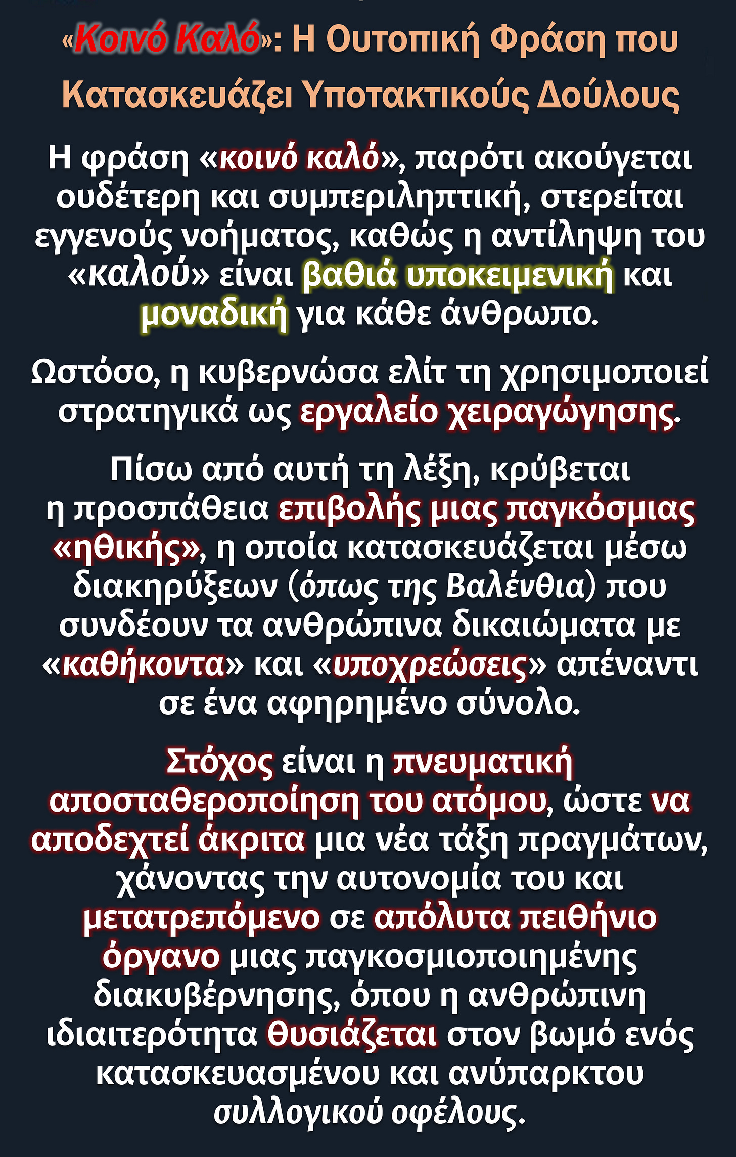 Αυτό που κατασκευάζεται δεν είναι απλώς ένα σύστημα διακυβέρνησης, ούτε καν μια νέα κουλτούρα - είναι ένα συνολικό επιστημικό καθεστώς. Αυτό που ενσωματώνει τη συναισθηματική ζωή, την πνευματικότητα, την ταυτότητα, την ατομική ηθική κρίση και την πολιτική δράση σε ένα ενιαίο, εύκολα εκμεταλλεύσιμο κυβερνητικό πλαίσιο.