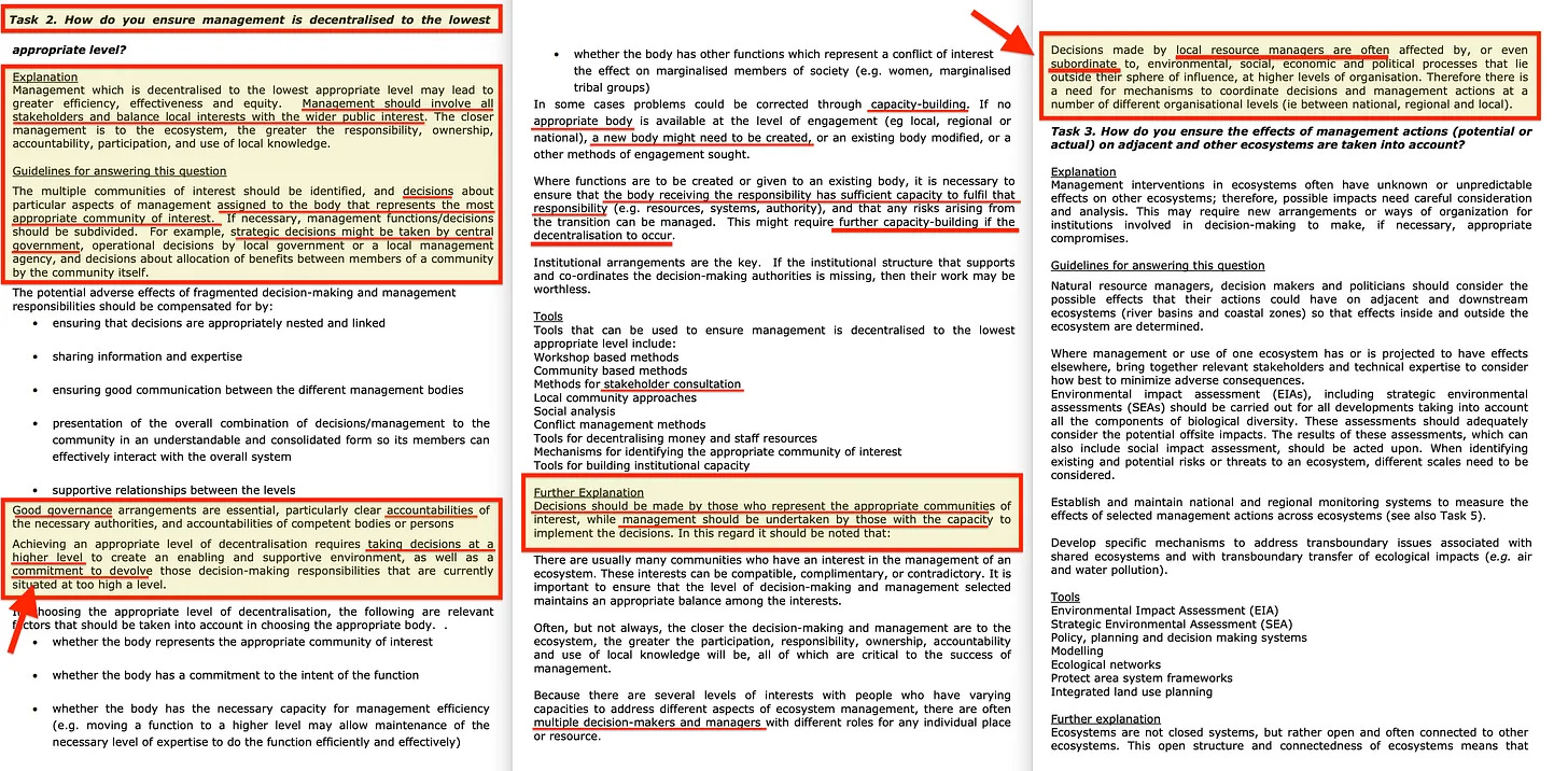 «Οι αποφάσεις που λαμβάνουν οι τοπικοί διαχειριστές πόρων συχνά επηρεάζονται από, ή ακόμη και υποτάσσονται σε, περιβαλλοντικές, κοινωνικές, οικονομικές και πολιτικές διαδικασίες που βρίσκονται εκτός της σφαίρας επιρροής τους, σε υψηλότερα επίπεδα οργάνωσης. Επομένως, υπάρχει ανάγκη για μηχανισμούς συντονισμού των αποφάσεων και των διαχειριστικών δράσεων σε διάφορα οργανωτικά επίπεδα (δηλαδή μεταξύ εθνικού, περιφερειακού και τοπικού).»