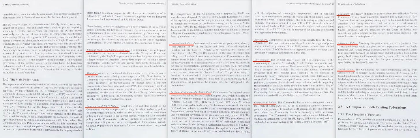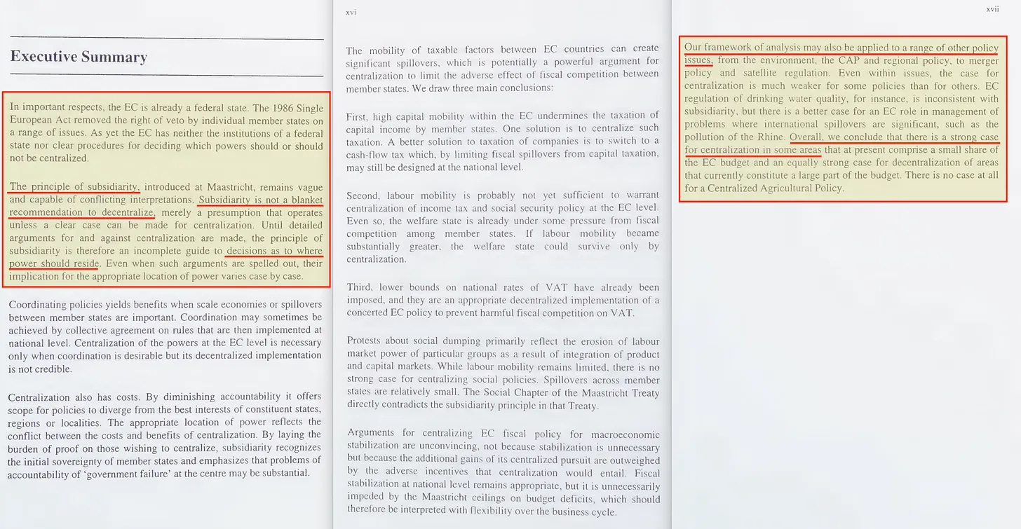 «Το πλαίσιο ανάλυσής μας μπορεί επίσης να εφαρμοστεί σε μια σειρά άλλων πολιτικών ζητημάτων... καταλήγουμε στο συμπέρασμα ότι υπάρχουν ισχυρά επιχειρήματα υπέρ της συγκέντρωσης σε ορισμένους τομείς που επί του παρόντος αποτελούν μικρό μέρος του προϋπολογισμού της ΕΚ και εξίσου ισχυρά επιχειρήματα υπέρ της αποκέντρωσης σε τομείς που επί του παρόντος αποτελούν μεγάλο μέρος του προϋπολογισμού».