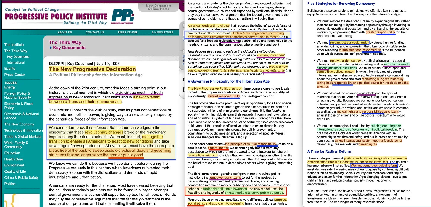«Η Αμερική χρειάζεται μια τρίτη επιλογή που να αντικαθιστά την αντανακλαστική υπεράσπιση του γραφειοκρατικού status quo από την αριστερά και να αντισταθμίζει την καταστροφική προσπάθεια της δεξιάς να διαλύσει απλά την κυβέρνηση. Μια τέτοια «νέα προοδευτική» φιλοσοφία διακυβέρνησης βλέπει την κυβέρνηση ως υπηρέτη της κοινωνίας, όχι ως αφέντη της – ως καταλύτη για μια ευρύτερη πολιτειακή επιχείρηση που ελέγχεται από και ανταποκρίνεται στις ανάγκες των πολιτών και των κοινοτήτων όπου ζουν και εργάζονται».