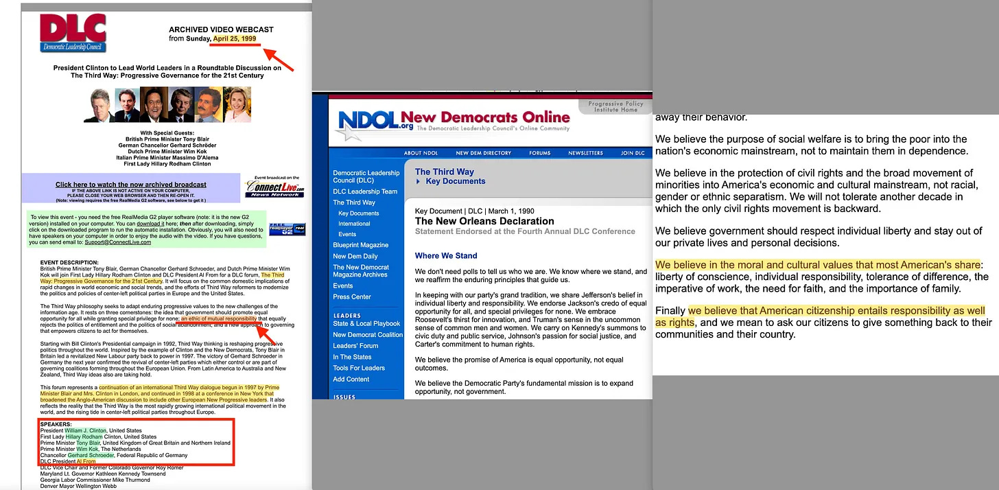 Ωστόσο, ο «Τρίτος Δρόμος» δεν ήταν αποκλειστικά βρετανική υπόθεση. Πολλές χώρες πειραματίστηκαν με κάτι παρόμοιο, συμπεριλαμβανομένων των Ηνωμένων Πολιτειών, της Γερμανίας, των Κάτω Χωρών και της Ιταλίας. Στην πραγματικότητα, όλες αυτές οι χώρες συνέβαλαν σε αυτή τη στρογγυλή τράπεζα τον Απρίλιο του 1999 [2], στην οποία συμμετείχε και η ίδια η Hillary Rodham Clinton. Και οι αρχές των «δικαιωμάτων και ευθυνών» μπορούν να αναχθούν ακόμη πιο πίσω, στο 1990, και στη «Διακήρυξη της Νέας Ορλεάνης» [3].