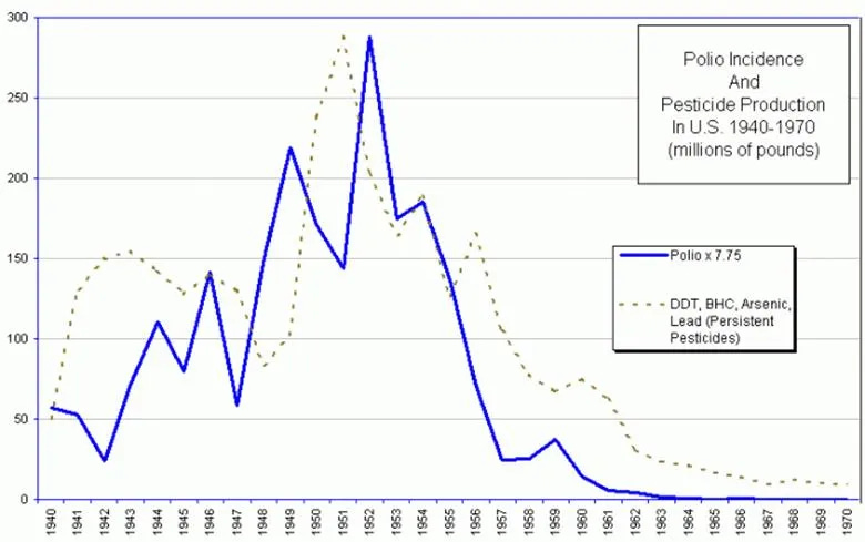 Το εμβόλιο της πολιομυελίτιδας συχνά χαιρετίζεται ως το καλύτερο παράδειγμα του πώς τα εμβόλια έχουν σώσει αμέτρητες ζωές. Ο Jonas Salk τιμάται για τη δωρεά του εμβολίου στην ανθρωπότητα, ενώ η κατοχύρωσή του με δίπλωμα ευρεσιτεχνίας θα μπορούσε να τον είχε κάνει πάμπλουτο. [5] Αυτή η αφήγηση αποκρύπτει μια πολύ διαφορετική εξήγηση για την ασθένεια που ονομάζεται πολιομυελίτιδα και έχει αποσπάσει την προσοχή από μια αλήθεια που κρύβεται σε κοινή θέα: η πολιομυελίτιδα στις δεκαετίες του 1940 και 1950 συνέπεσε με την εκτεταμένη χρήση αρσενικού και DDT ως φυτοφαρμάκων, και η επιδημία εξασθένησε με τη μείωση της χρήσης αυτών των δηλητηρίων. Όταν το εμβόλιο της πολιομυελίτιδας τέθηκε σε χρήση, μετά το 1955, η πολιομυελίτιδα βρισκόταν ήδη σε ραγδαία πτώση, η οποία συνεχίστηκε μέχρι την απαγόρευση του DDT στο μεγαλύτερο μέρος του κόσμου στις αρχές της δεκαετίας του 1970. Το παρακάτω γράφημα δείχνει την παράλληλη πορεία της χρήσης του DDT και των διαγνώσεων πολιομυελίτιδας. Αν βρείτε το 1955 στο γράφημα, θα δείτε ότι η συχνότητα εμφάνισης και των δύο ήταν σε πτώση.