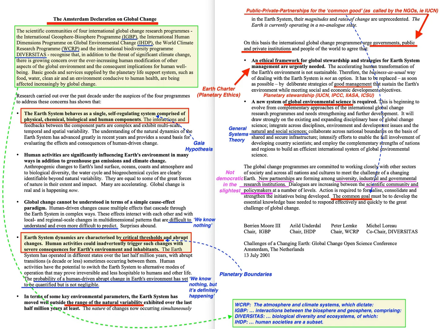 Αυτό το συστημικό όραμα επισημοποιήθηκε τελικά το 2001 με τη Διακήρυξη του Άμστερνταμ για την Παγκόσμια Αλλαγή [23] , η οποία ανακήρυξε την ανθρωπότητα σε «μείζονα δύναμη του πλανητικού μετασχηματισμού» και κάλεσε για ολοκληρωμένη επιστήμη των γήινων συστημάτων που θα στηρίξει τη διακυβέρνηση. Αυτή η δήλωση έθεσε τα πνευματικά θεμέλια για το Πρόγραμμα Διακυβέρνησης του Γήινου Συστήματος, το οποίο ξεκίνησε με φόντο την κατάρρευση των χρηματοπιστωτικών αγορών το 2009 και δημιούργησε ένα πλαίσιο που δεν στηρίζεται σε δημοκρατικές αρχές, αλλά στη μηχανική των συστημάτων. Είναι σημαντικό ότι η Διακήρυξη του 2001 προέκυψε ως μια συντονισμένη σύμπραξη στην οποία συμμετείχαν τέσσερα βασικά διεθνή ερευνητικά προγράμματα: το Παγκόσμιο Πρόγραμμα Έρευνας για το Κλίμα (WCRP), το Διεθνές Πρόγραμμα Γεωσφαίρας-Βιόσφαιρας (IGBP), το DIVERSITAS (με επίκεντρο τη βιοποικιλότητα και τα οικοσυστήματα) και το Διεθνές Πρόγραμμα Ανθρώπινων Διαστάσεων για την Παγκόσμια Περιβαλλοντική Αλλαγή (IHDP), το οποίο μελετούσε τις πτυχές της συμπεριφοράς και της διακυβέρνησης της αλληλεπίδρασης ανθρώπου-περιβάλλοντος.