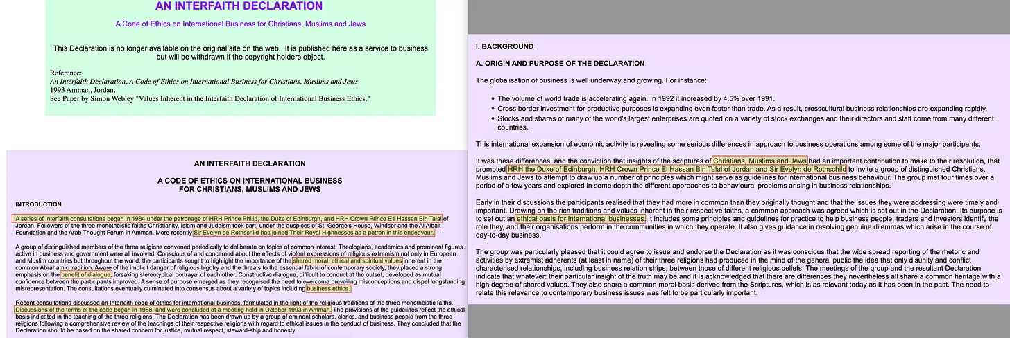 Αλλά οι βαθύτερες ρίζες αυτού του παραδείγματος περιλαμβάνουν και άλλα λιγότερο γνωστά ορόσημα. Πέρα από την ιδεολογική γραμμή του Julius Wolf, του Eduard Bernstein και του Leonard S. Woolf, το έτος 1984 υπήρξε επίσης μάρτυρας της εμφάνισης της Διαθρησκειακής Διακήρυξης: Ένας Κώδικας Δεοντολογίας Για Τις Διεθνείς Επιχειρήσεις Για Χριστιανούς, Μουσουλμάνους Και Εβραίους [26] - μια προσπάθεια που, το 1988, περιελάμβανε άμεση συνεργασία με την Evelyn de Rothschild [27]. Ο στόχος της ήταν αδιαμφισβήτητος: να ευθυγραμμιστεί το παγκόσμιο εμπόριο με μια παγκόσμια ηθική αφήγηση.