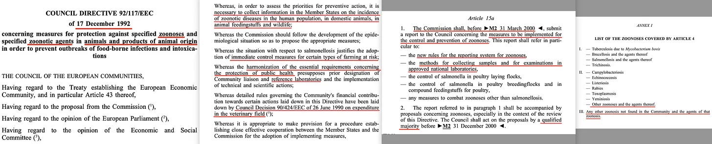 Οι ζωονόσοι ήταν - ελλείψει καλύτερης λέξης - η κόλλα που ενσωμάτωσε την ανθρωπότητα στο περιβαλλοντικό πλαίσιο της «Ενιαίας Υγείας», η οποία εκλεπτύνθηκε και επισημοποιήθηκε στο εξειδικευμένο πλαίσιο των πανδημιών στο πλαίσιο της Συνθήκης για την Πανδημία που βρίσκεται υπό διαπραγμάτευση. Όμως η πρωτοβουλία αυτή ξεκίνησε πολύ νωρίτερα, με τον William Foege να υπογράφει το Σχέδιο Πανδημίας των ΗΠΑ το 1978 - τον ίδιο Foege που, στο Κέντρο Rockefeller το 2004, θα παρουσίαζε επίσημα στον κόσμο τις 12 Αρχές του Μανχάταν (επίσης γνωστές ως Ενιαία Υγεία / One Health). Τα φώτα της δημοσιότητας πρέπει επίσης να πέσουν επάξια στο Σχέδιο Πανδημίας Γρίπης του ΠΟΥ του 1999, το οποίο, στην ουσία, συντάχθηκε εξ ολοκλήρου από την Ευρωπαϊκή Επιστημονική Ομάδα Εργασίας για τη Γρίπη - μια ομάδα πίεσης των φαρμακευτικών εταιρειών που είχε σημάνει αμφισβητήσιμα τον συναγερμό το 1997 σχετικά με το εξαιρετικά απίθανο ξέσπασμα του Η5Ν1 στο Χονγκ Κονγκ.