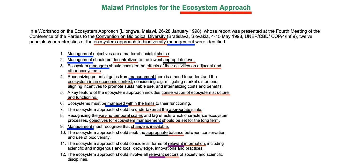 Και όλα αυτά στηρίζονται στη διακυβέρνηση των ενδιαφερομένων μερών -που με μεγαλύτερη ακρίβεια περιγράφεται ως αντιδημοκρατική διαμεσολάβηση- με ολόκληρο τον κόσμο να εντάσσεται σταδιακά σε μια τυποποιημένη ιεραρχία. Η αρχή της επικουρικότητας επικαλείται συχνά για να δικαιολογήσει αυτή τη δομή, ισχυριζόμενη ότι «αποκεντρώνει τις αποφάσεις στο χαμηλότερο κατάλληλο επίπεδο», μια φράση η οποία θα πρέπει να είναι γνωστή σε όσους γνωρίζουν καλά την αρχή 2 [30] της Προσέγγισης του Οικοσυστήματος.