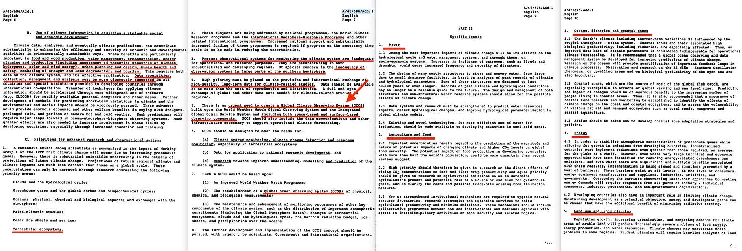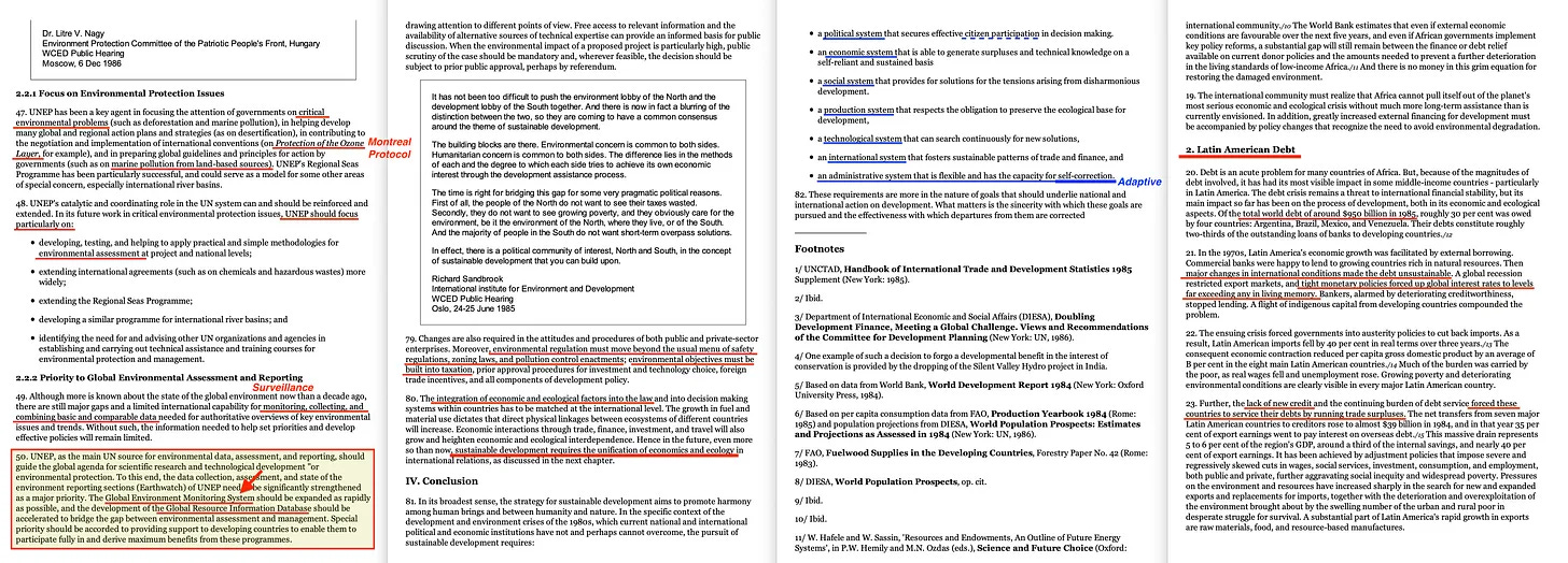 Άλλοι όροι ενδιαφέροντος ξεχωρίζουν επίσης. Αναφέρεται ρητά το Παγκόσμιο Σύστημα Παρακολούθησης Περιβάλλοντος, το οποίο υποδεικνύει μια πλανητική αρχιτεκτονική επιτήρησης. Το Πρωτόκολλο του Montreal λαμβάνει έμμεση αναφορά, όπως και η έκκληση για τη συγχώνευση της οικονομίας και της οικολογίας - μια συγχώνευση που θα υλοποιηθεί αργότερα μέσω προτάσεων όπως τα ψηφιακά νομίσματα κεντρικών τραπεζών (CBDCs) που υποστηρίζονται από τον άνθρακα. Το έγγραφο τάσσεται επίσης υπέρ των προσαρμοστικών συστημάτων (αν και ποτέ δεν τα κατονομάζει ως τέτοια) και αναγνωρίζει ανοιχτά την κλίμακα της κρίσης χρέους της Λατινικής Αμερικής.