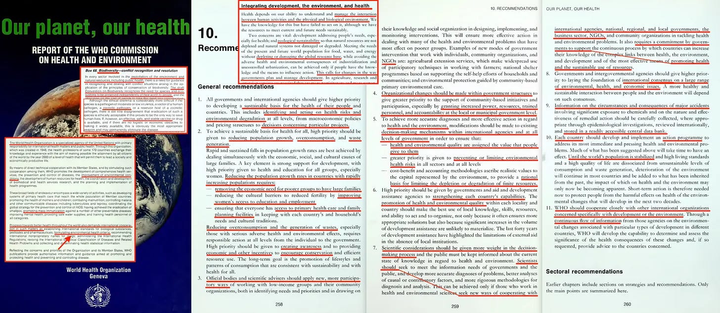 Το 1992, ο Παγκόσμιος Οργανισμός Υγείας δημοσίευσε τη μελέτη «Ο πλανήτης μας, η Υγεία μας» [61] , η οποία καθιέρωσε μια άμεση σχέση μεταξύ της οικολογικής υποβάθμισης και της δημόσιας υγείας. Εισήγαγε μια συστημική θεώρηση της υγείας ως αποτέλεσμα των περιβαλλοντικών και κοινωνικοοικονομικών συνθηκών, θέτοντας το εννοιολογικό υπόβαθρο για μελλοντικά πλαίσια όπως η “Ενιαία Υγεία” (One Health) και το Planetary Health και ενισχύοντας το ρόλο της υγείας ως νομιμοποιητική αφήγηση για την παγκόσμια περιβαλλοντική διακυβέρνηση.