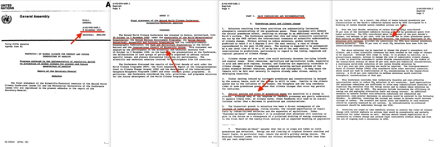 Και όλα αυτά ενώ το Πρωτόκολλο του Montreal δημιούργησε τη μεταβιβάσιμη άδεια εκπομπής, η οποία θα γινόταν, μέσω της ενδιάμεσης ομάδας εργασίας ΙΙΙ της IPCC (Διακυβερνητική Επιτροπή για την Κλιματική Αλλαγή) (το 1990 [10], το 1992 το σύστημα νομισματοποίησης που ξεκίνησε μέσω της Καταπολέμησης της Υπερθέρμανσης του Πλανήτη, καθώς η Σύμβαση για τη Βιολογική Ποικιλότητα και η Σύμβαση-Πλαίσιο των Ηνωμένων Εθνών για την Κλιματική Αλλαγή δημιουργήθηκαν στη Σύνοδο Κορυφής του Ρίο.