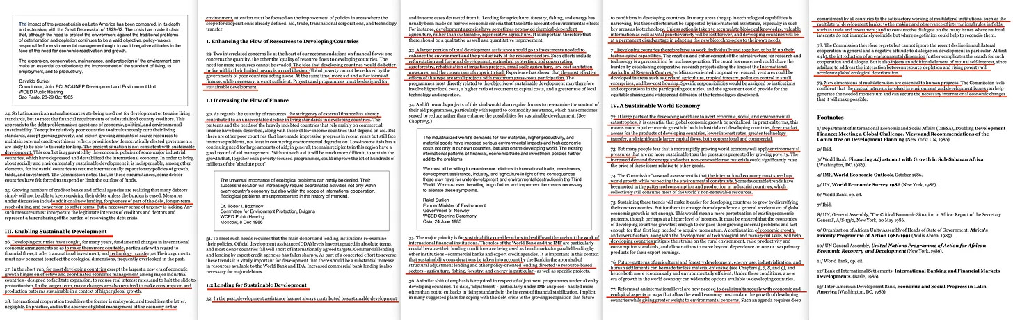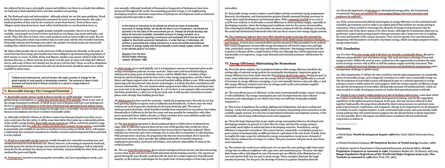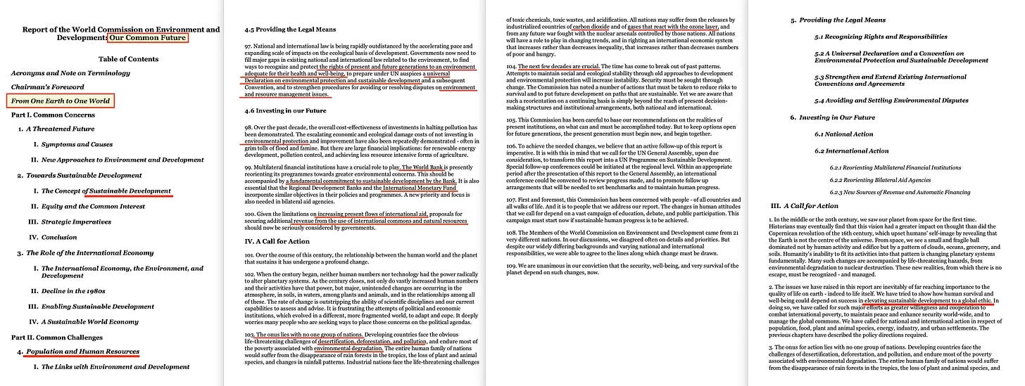 Το Κοινό μας Μέλλον [14] της Brundtland είναι ένα ακόμη έγγραφο που σκόπιμα απέφυγα να διαβάσω. Βλέπετε, πρόκειται για ένα ακόμη έγγραφο που είναι γεμάτο από φιλοδοξίες, ρητορική που προκαλεί ευεξία, αλλά το οποίο προσφέρει πολύ λίγη σαφήνεια σχετικά με το τι πραγματικά θέλει να κάνει. Το ίδιο μοτίβο επαναλαμβάνεται σε όλο το σύστημα των Ηνωμένων Εθνών, με την Ατζέντα 21 να αποτελεί ένα ιδιαίτερα... συγκεχυμένο, αλλά και σχετικό παράδειγμα.