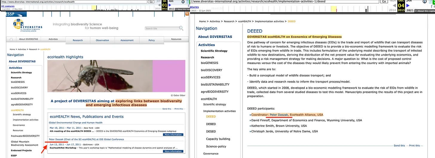 Το 1991, το πρόγραμμα DIVERSITAS [55] καθιερώθηκε ως παγκόσμια επιστημονική πρωτοβουλία για τη βιοποικιλότητα, με τη συγχρηματοδότηση του ICSU, της UNESCO και του UNEP και με τον Peter Daszak [56] στο δυναμικό του. Στόχος του ήταν η παραγωγή ολοκληρωμένης έρευνας για τη βιοποικιλότητα προς υποστήριξη της αναδυόμενης Σύμβασης για τη Βιολογική Ποικιλότητα (CBD), συμβάλλοντας με επιστημονικά διαπιστευτήρια στη διαμόρφωση της φύσης ως διαχειρίσιμου συστήματος στο πλαίσιο της παγκόσμιας διακυβέρνησης.