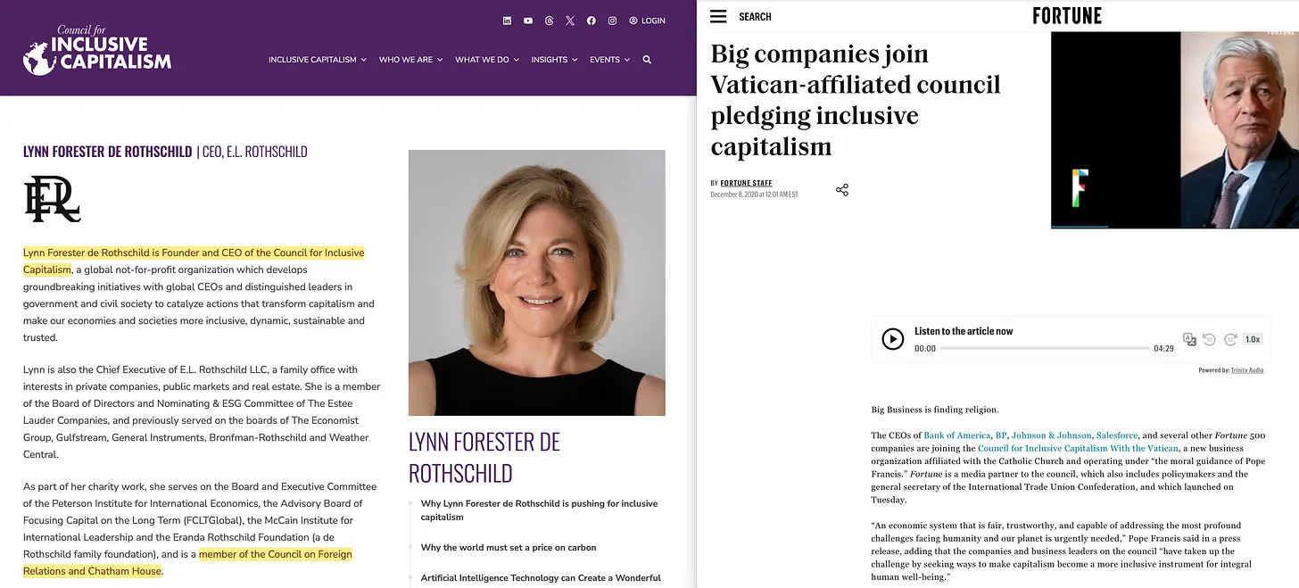 Το 2014, η Διάσκεψη για τον Καπιταλισμό Χωρίς Αποκλεισμούς, που φιλοξενήθηκε στο Λονδίνο και υποστηρίχθηκε από το Ίδρυμα Rothschild και εκπροσώπους του Βατικανού, συγκέντρωσε διευθύνοντες συμβούλους, χρηματοδότες και δημόσιους αξιωματούχους για να επαναπροσδιορίσουν τον καπιταλισμό ως δύναμη κοινωνικής συνοχής [78]. Υποστηρίζοντας τη μακροπρόθεσμη δημιουργία αξίας και την ηθική υπευθυνότητα στις αγορές, η πρωτοβουλία προσπάθησε να συμφιλιώσει το κέρδος με τον σκοπό -ενισχύοντας την ευθυγράμμιση μεταξύ της παγκόσμιας οικονομίας, του ηθικού οικουμενισμού και της διακυβέρνησης των ενδιαφερόμενων μερών.