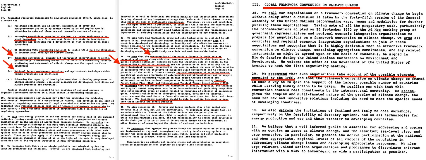 Επίσης, το 1992, οι συνθήκες CBD και UNFCCC εγκαινιάστηκαν επίσημα στη Σύνοδο Κορυφής του Ρίο για τη Γη - δημιουργώντας το θεμελιώδες νομικό πλαίσιο για την παγκόσμια περιβαλλοντική διακυβέρνηση, τελικά μέσω της εκπομπής και δέσμευσης άνθρακα.
