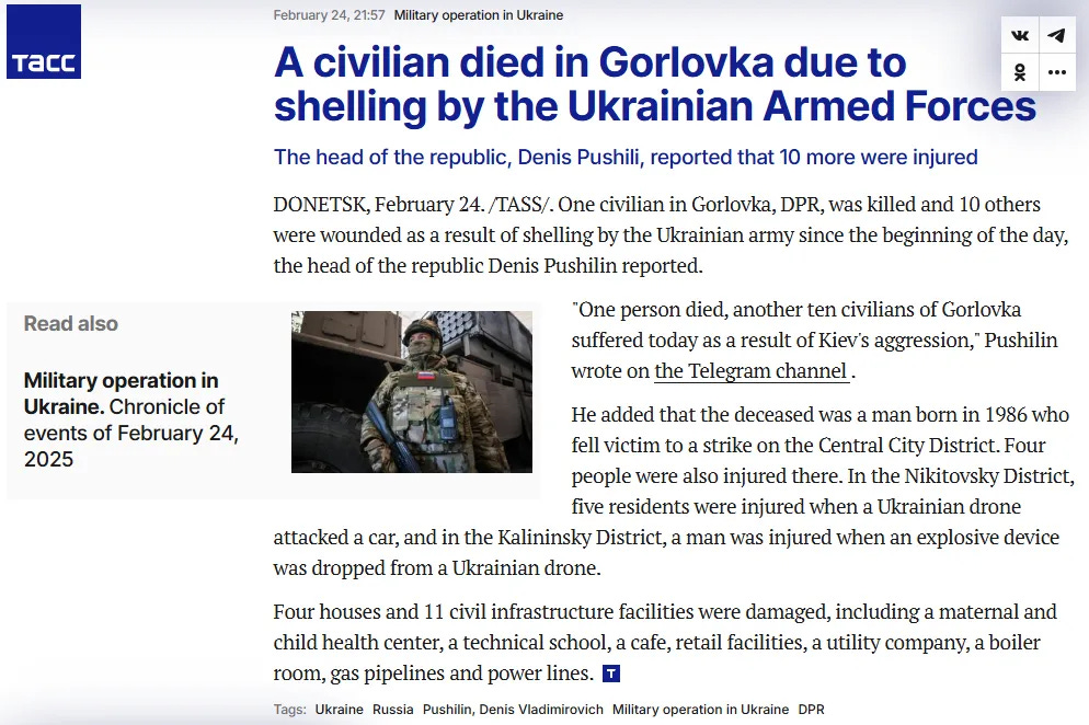 (Ίσως αναρωτιέστε πώς είναι δυνατόν, μετά από τρία χρόνια ειδικών στρατιωτικών επιχειρήσεων (SMO) για την «προστασία του λαού του Donbass», μια πόλη που βρίσκεται σε απόσταση μικρότερη των 60 χιλιομέτρων από το Donetsk να εξακολουθεί να βομβαρδίζεται από τον ουκρανικό στρατό. Και εσύ και εγώ, φίλε).