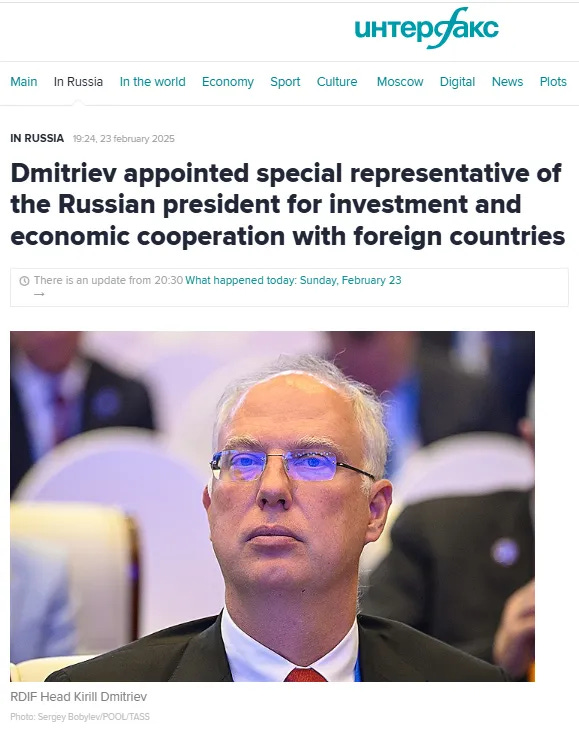 Προφανώς ο Dmitriev έχει κάνει υποδειγματική δουλειά, γιατί στις 23 Φεβρουαρίου ο Πούτιν τον διόρισε «ειδικό εκπρόσωπο του Ρώσου προέδρου για επενδύσεις και οικονομική συνεργασία με ξένες χώρες».