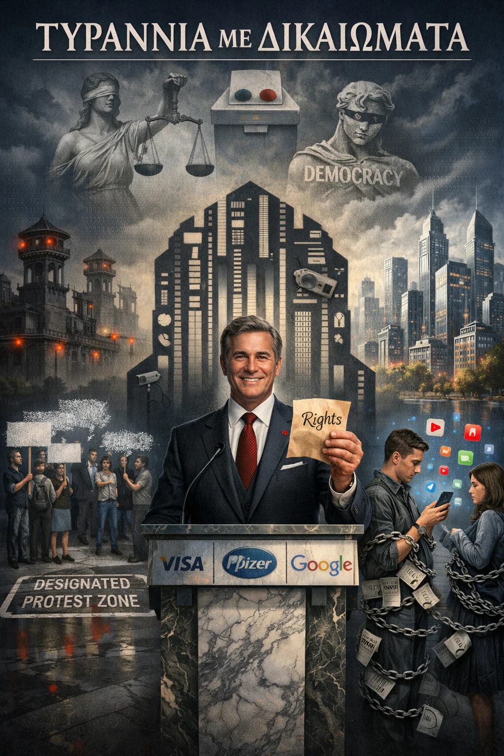 Μια άλλη λέξη είναι η τυραννία. Απλώς δεν τη χρησιμοποιούμε επειδή η εικόνα δεν ταιριάζει - ούτε στολές, ούτε συλλαλητήρια, ούτε λατρεία της προσωπικότητας. Απλώς άνδρες με ακριβά κοστούμια που λαμβάνουν αποφάσεις σε δωμάτια στα οποία δεν θα εισέλθετε ποτέ, για συστήματα για τα οποία δεν μπορείτε να ψηφίσετε ουσιαστικά, με συνέπειες που θα διαμορφώσουν τη ζωή σας είτε συναινείτε είτε όχι.