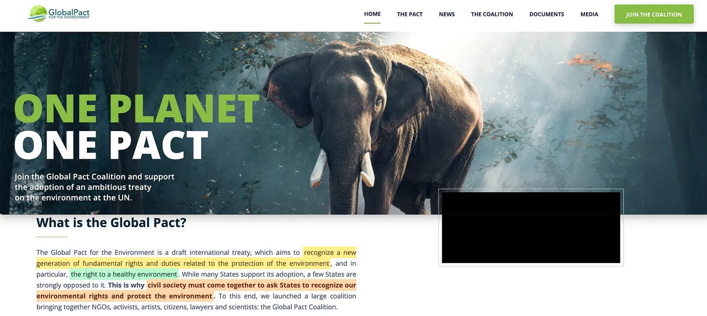 «Το Παγκόσμιο Σύμφωνο για το Περιβάλλον είναι ένα σχέδιο διεθνούς συνθήκης, το οποίο αποσκοπεί στην αναγνώριση μιας νέας γενιάς θεμελιωδών δικαιωμάτων και υποχρεώσεων που σχετίζονται με την προστασία του περιβάλλοντος, και ιδίως του δικαιώματος σε ένα υγιές περιβάλλον. Ενώ πολλά κράτη υποστηρίζουν την υιοθέτησή του, μερικά κράτη αντιτίθενται σθεναρά σε αυτό. Γι’ αυτό η κοινωνία των πολιτών πρέπει να ενωθεί για να ζητήσει από τα κράτη να αναγνωρίσουν τα περιβαλλοντικά μας δικαιώματα και να προστατεύσουν το περιβάλλον»