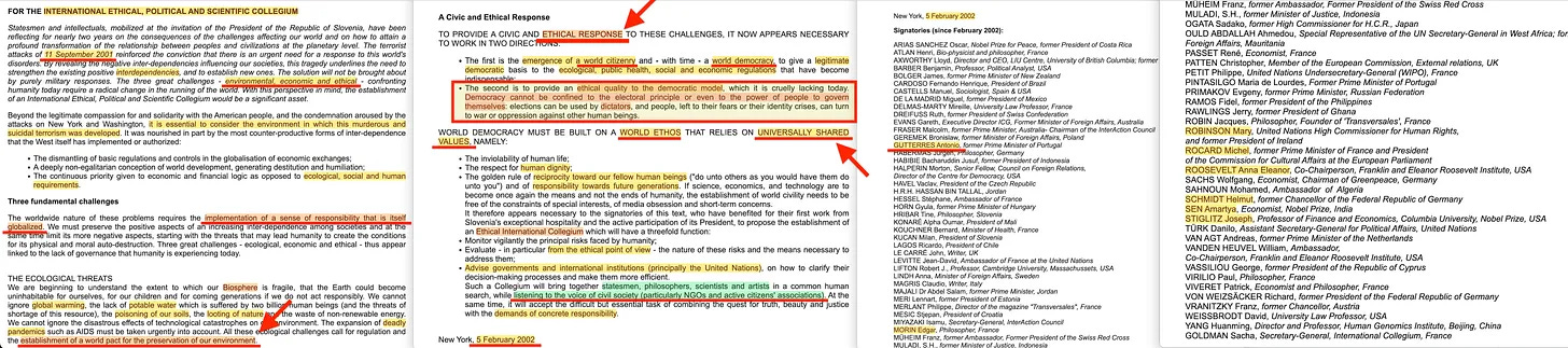 Αλλά το 2009 έλαβε χώρα και κάτι άλλο. Όχι, δεν μιλάω για την υποτιθέμενη πανδημία τότε, αλλά μάλλον για αυτή την έκδοση από το Collegium International [12]- «Σχέδιο Χάρτας για την Παγκόσμια Διακυβέρνηση»- η οποία αναφέρει -