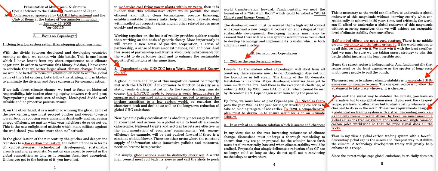 Και αυτό μας φέρνει πίσω σε μια εκδήλωση τον Ιανουάριο του 2009 που συνδιοργανώθηκε από την GLOBE International και τη Λέσχη της Ρώμης: «Focus on Copenhagen» [10] πριν από την COP15 εκείνης της χρονιάς, η οποία μας έφερε την «αποτυχημένη» Συμφωνία της Κοπεγχάγης, η οποία χορήγησε δισεκατομμύρια σε ιδρύματα, αλλά αυτή ήταν επίσης η χρονιά κατά την οποία ολόκληρη η αφήγηση σχεδόν κατέρρευσε μέσω του Climategate, το οποίο έδειξε τίποτα λιγότερο από συστημική απάτη.