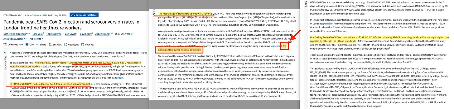 «... εγγράψαμε 200 HCWs που έρχονται σε επαφή με ασθενείς μεταξύ 26 Μαρτίου και 8 Απριλίου 2020, στο SARS-CoV-2 Acquisition in Frontline Healthcare Workers... 87 (44%) από τους 200 HCWs είχαν ενδείξεις λοίμωξης SARS-CoV-2 σε οποιοδήποτε χρονικό σημείο... Η διάμεση ηλικία των συμμετεχόντων στη μελέτη ήταν 34 έτη... Κανένας συμμετέχων δεν χρειάστηκε εισαγωγή στο νοσοκομείο».